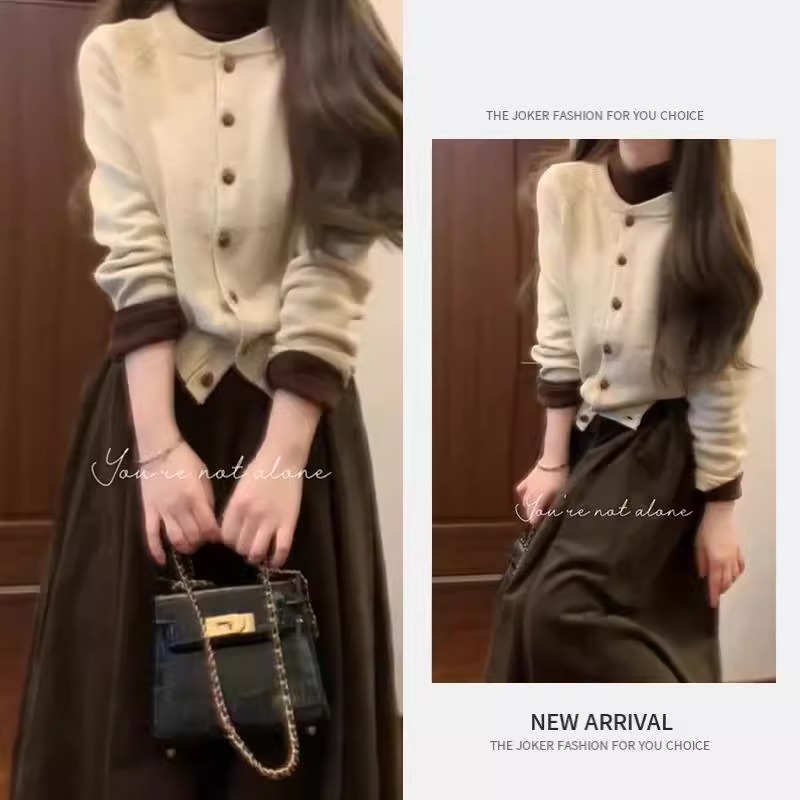 秋の塩系の軽熟風は女性の年齢を減らす気質を着て偽の上着の隠れた半身のスカートの2つのセットをつなぎ合わせます。