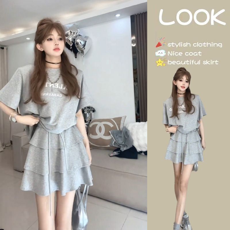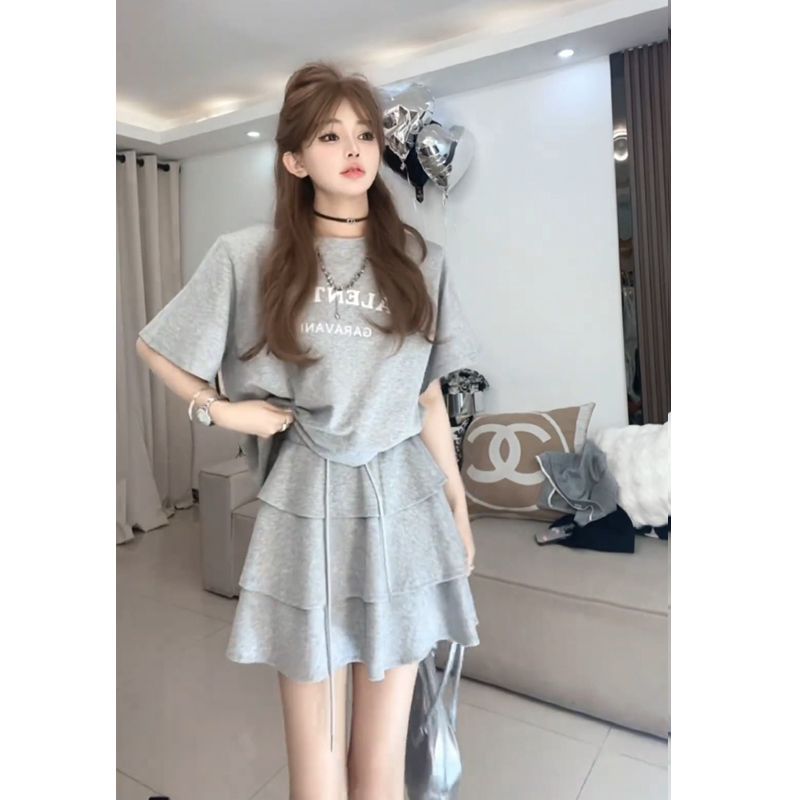 外国貿易韓国版インファッションパーソナライズスーツ女性の夏の新しいプリント半袖Tシャツケーキスカート2点セット
