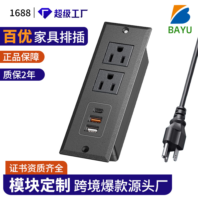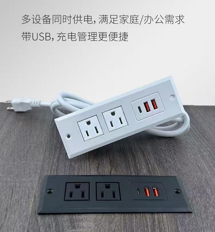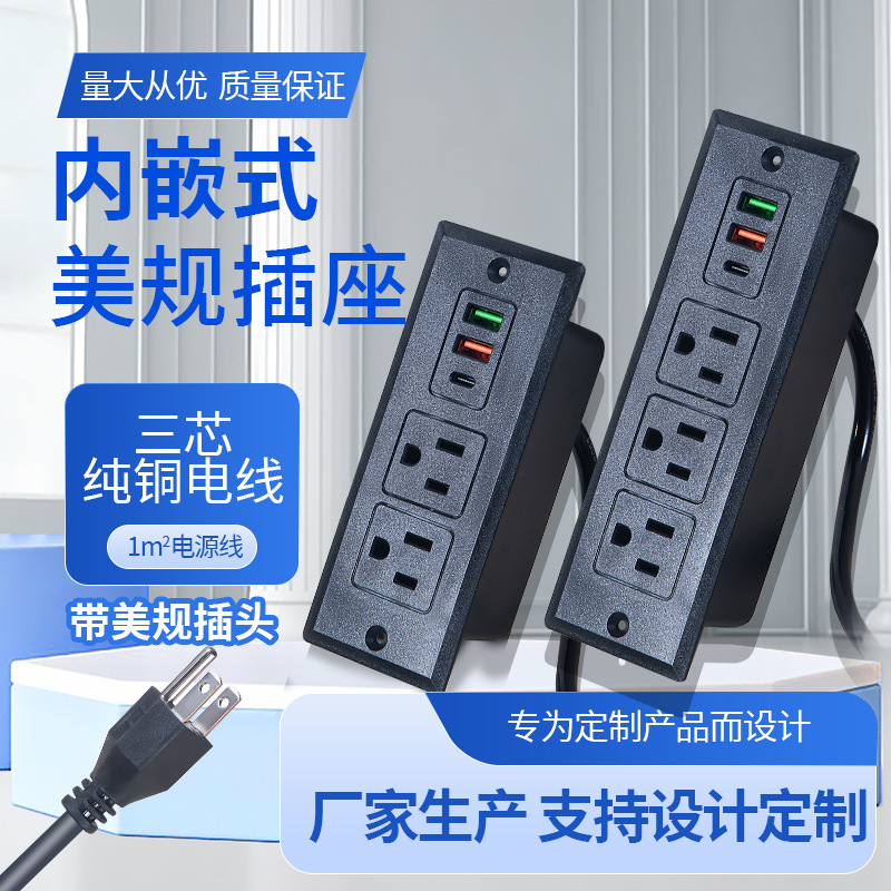 美标插排办公桌面床头书柜排插美规UL嵌入式插座USB电源家具插板