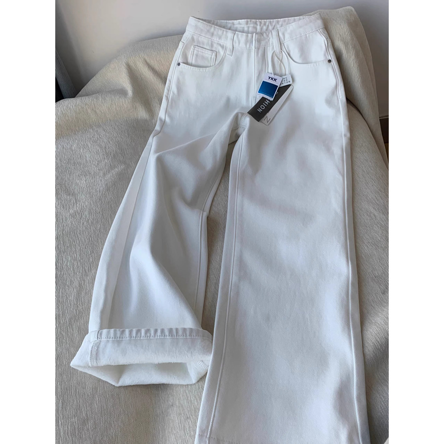 白色高腰阔腿加绒加厚牛仔裤女秋冬季大码胖mm直筒宽松显瘦拖地裤