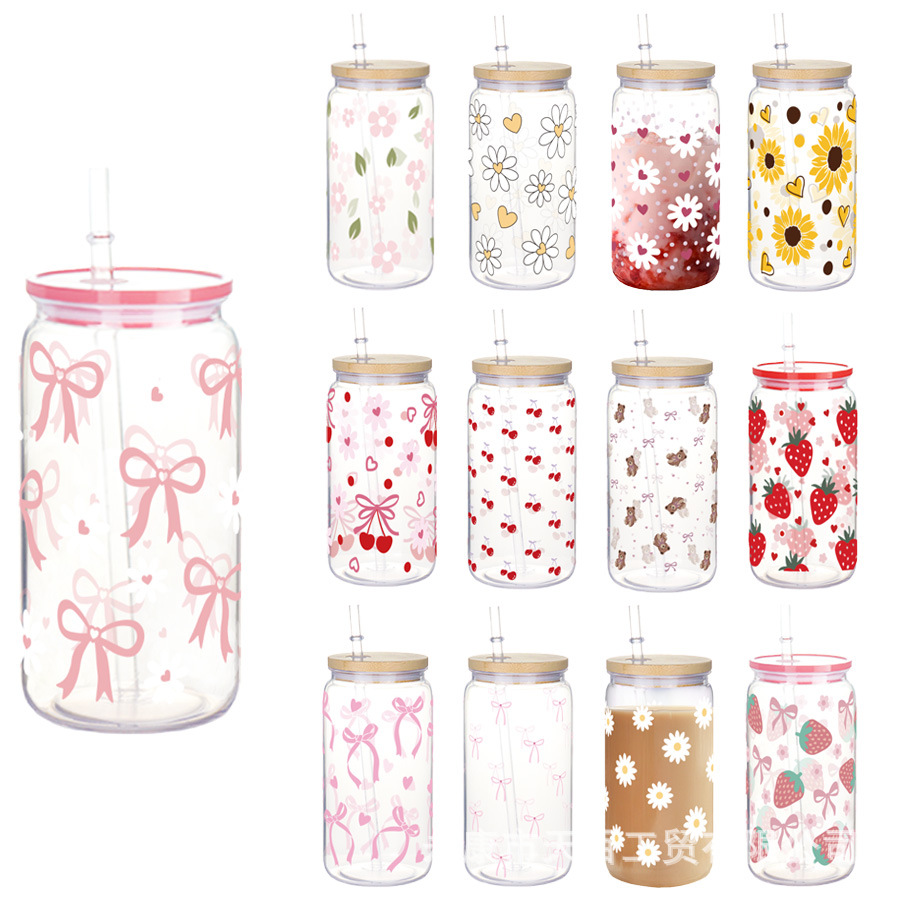 印花易拉罐造型可乐杯单层塑料吸管梅森杯子带盖网红饮料果汁水杯