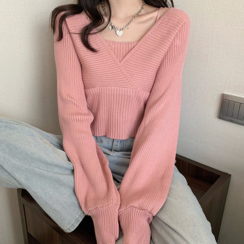 新作レディースフレンチニット長袖秋韓国風オフショルダー細見えニッチフェイクツーピースウエストシェイプ