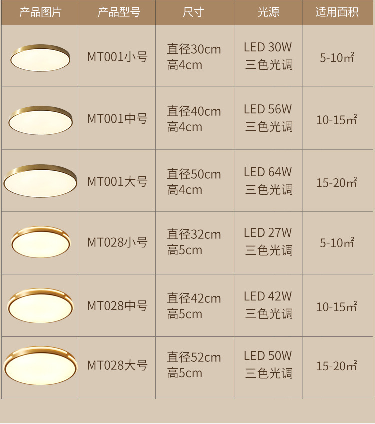 光源の電力 MT001 全銅製小型シーリングランプ(5~10人に適した3色調光)㎡),MT001 全銅製中型シーリングランプ(3トーン照明は10-15に適しています)㎡),MT001 全銅製大型シーリングランプ(15~20歳向けの3色調光)㎡),MT028 全銅製小型シーリングランプ(5~10人に適した3色点灯)㎡),MT028 全銅製中型シーリングランプ (3トーン照明は10-15に適しています)㎡),MT028 全銅製大型シーリングランプ(15~20歳向けの3色調光)㎡)