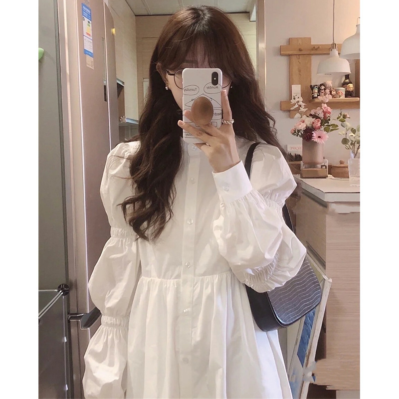 韓国シックな春のシンプルな気質ラペルプリーツルーズシングルブレストパフスリーブショートベビードールドレス