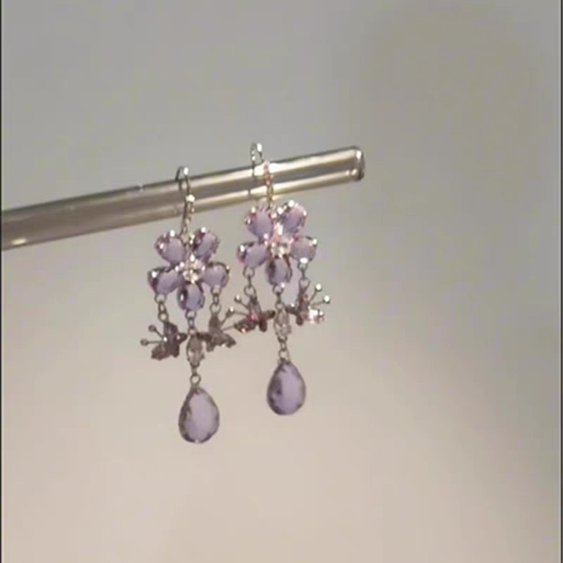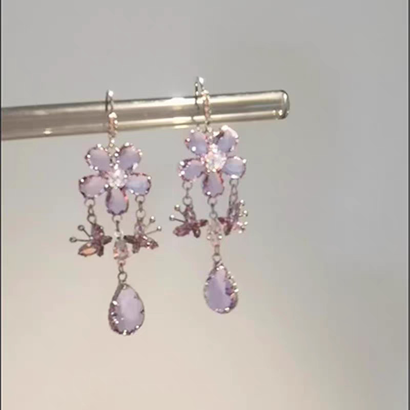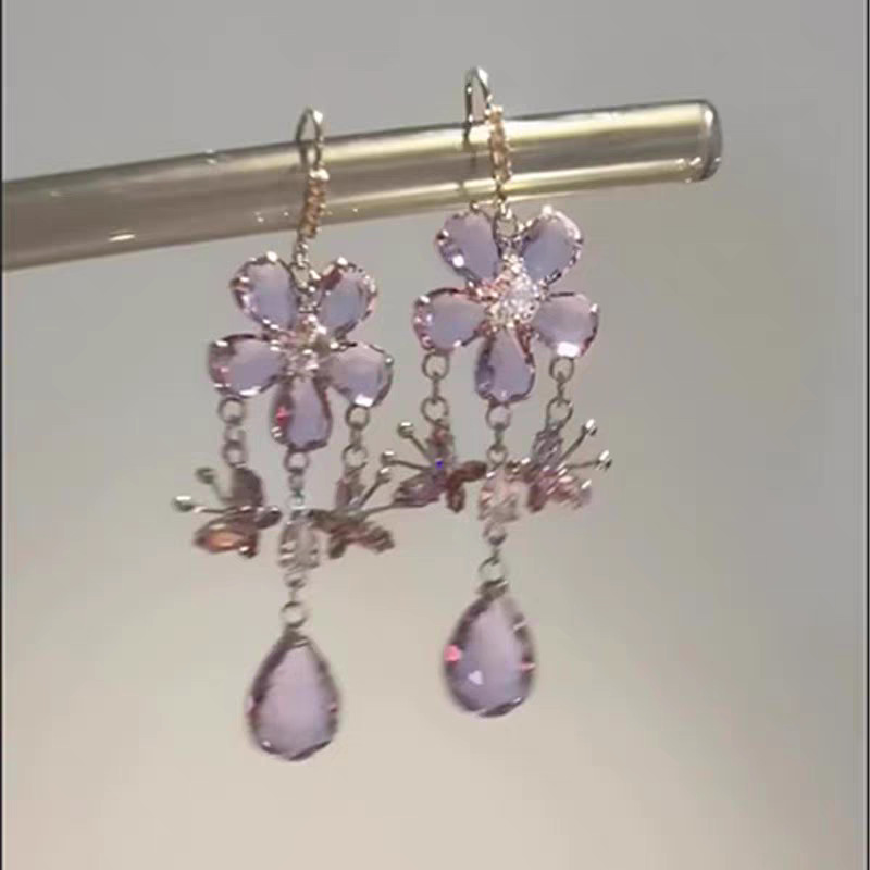 「パープルドリーム」ラインストーンバタフライドロップタッセルイヤリングクールで絶妙で優しい気質の女性用フラワーイヤリング