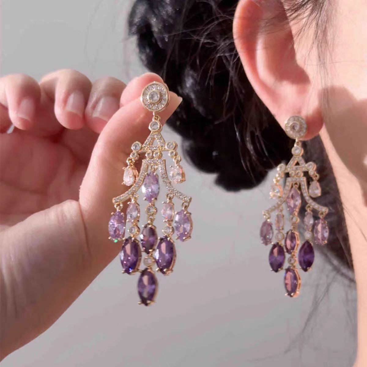 パープルウォータードロップジルコンヘビーデューティタッセルイヤリングフレンチレトロスーパーフラッシュフルダイヤモンドロング誇張宴会イヤリング