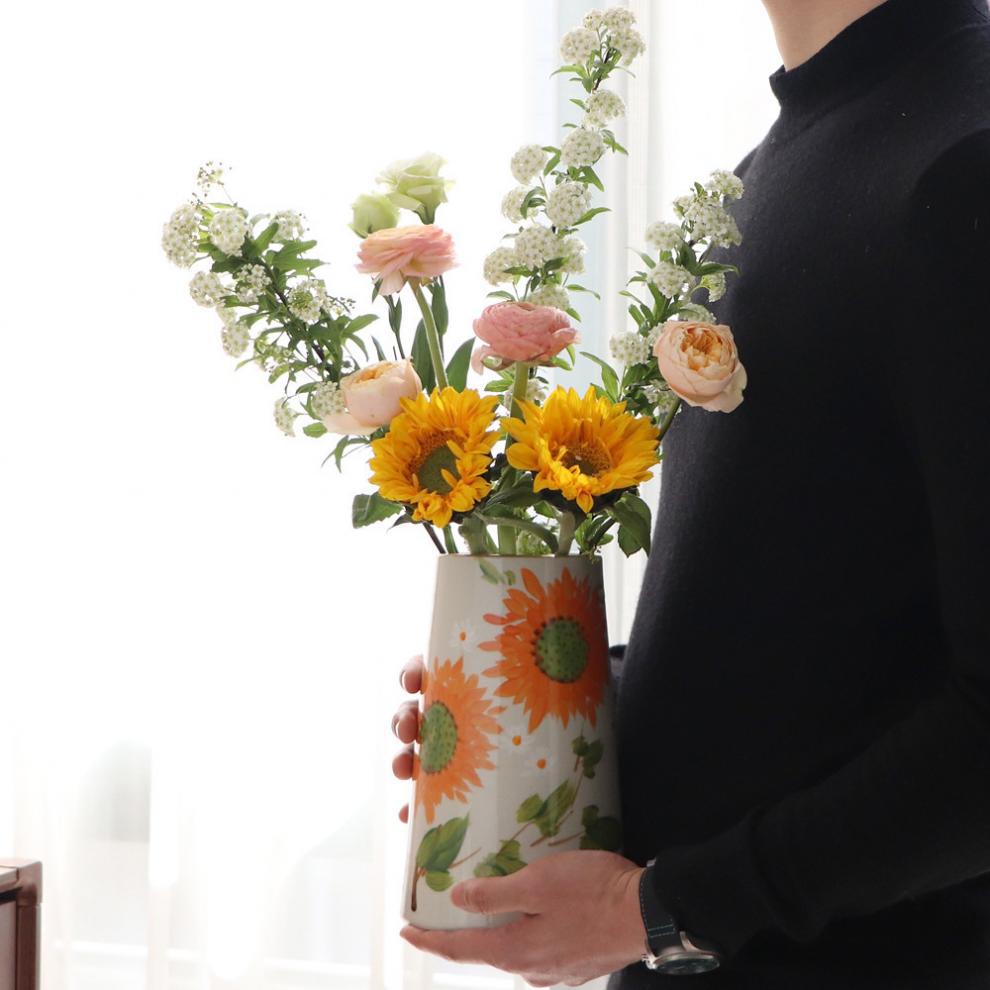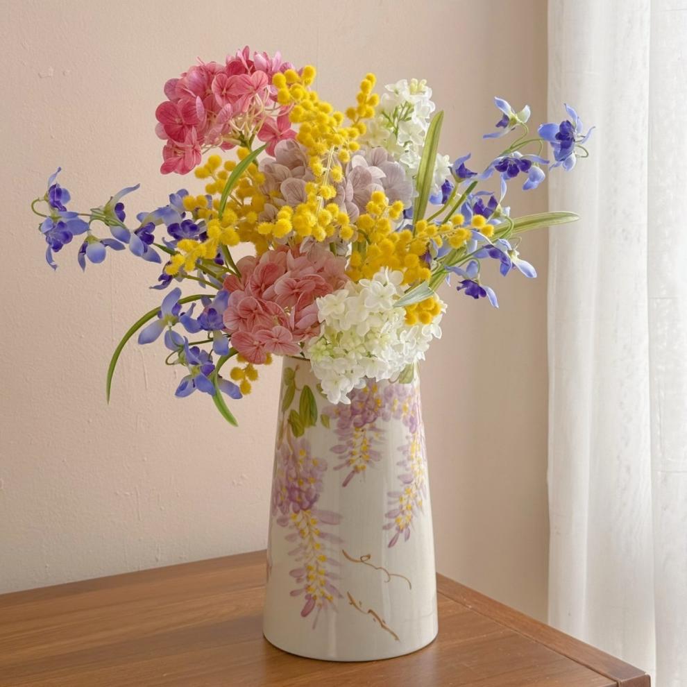 サイズ 藤,ひまわり,新鮮な藤,天球アイリス(花なし),天丘菜の花(花なし),花のないまっすぐな藤,花のない真っ直ぐなアジサイ,花のない丸い瓶の菜の花,ストレートチューブアリッサム,花のない美しいアイリス,花のない直線的なポピー,花のないミルクジャーローズ,花のないバラの円錐形,花のない円錐形のデイジー,丸い瓶のブドウ