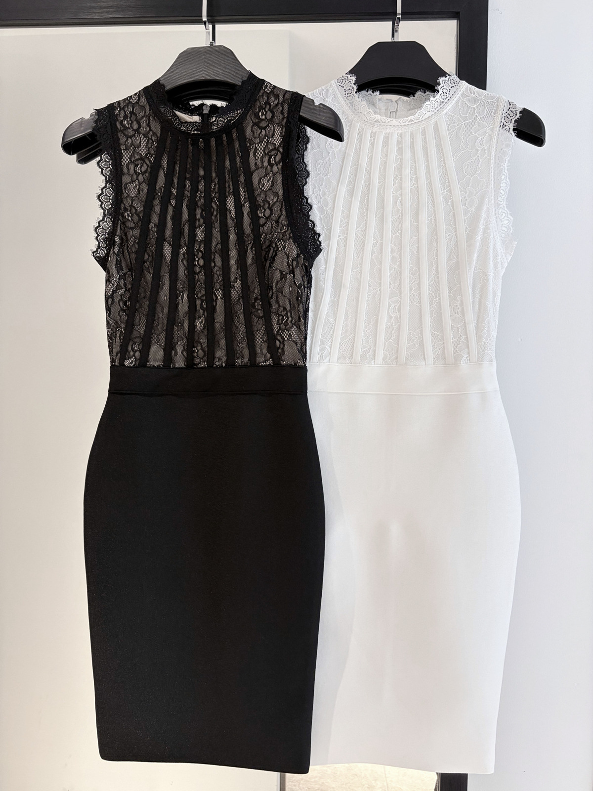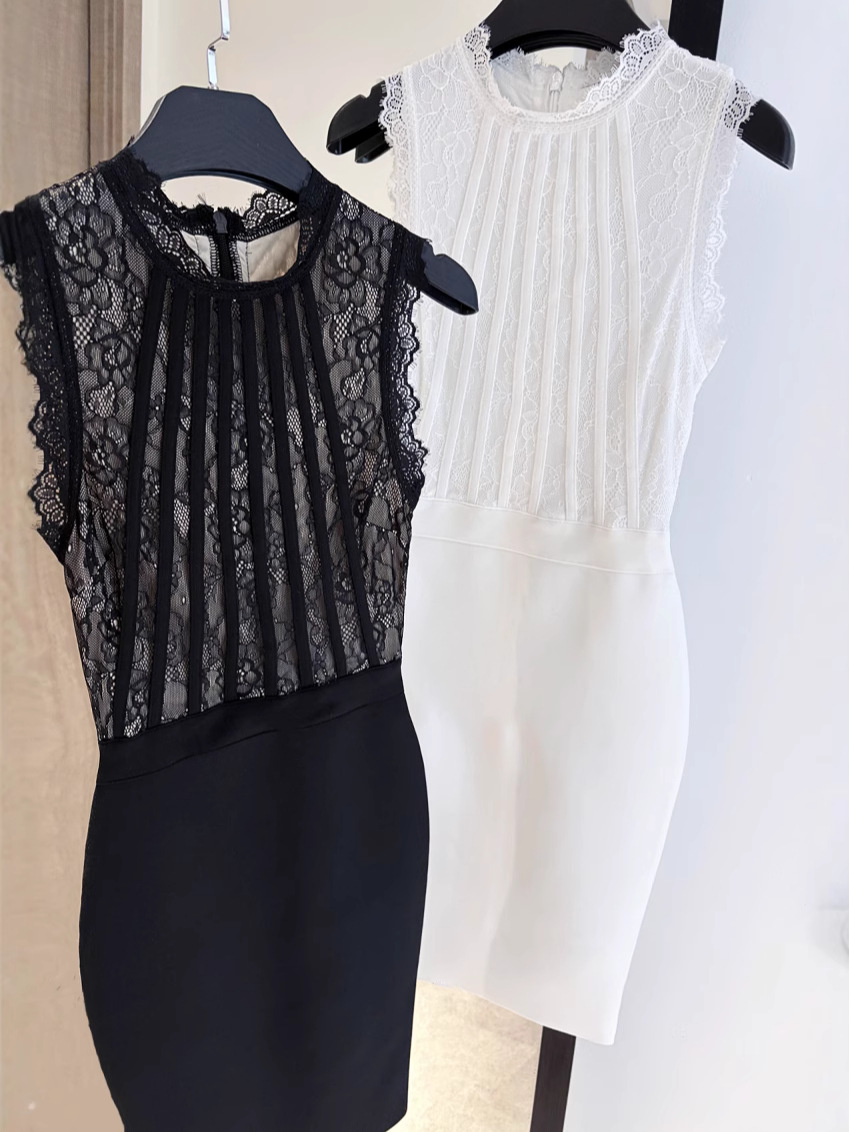 スリムでエレガントな黒と白のレースドレス、タイトフィットヒップスカートドレス、包帯スカート