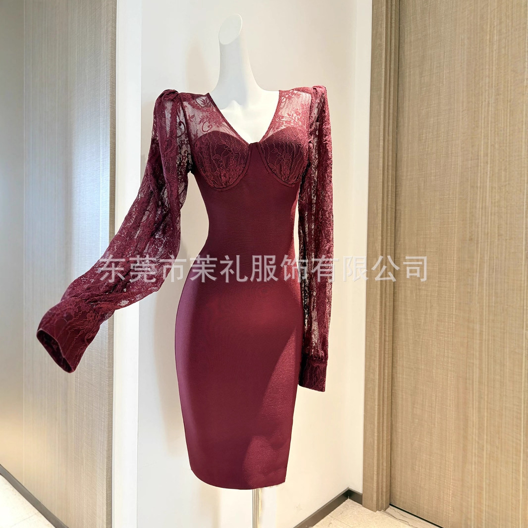 速卖通亚马逊欧美新款蕾丝酒红V领垫肩连衣裙绷带裙