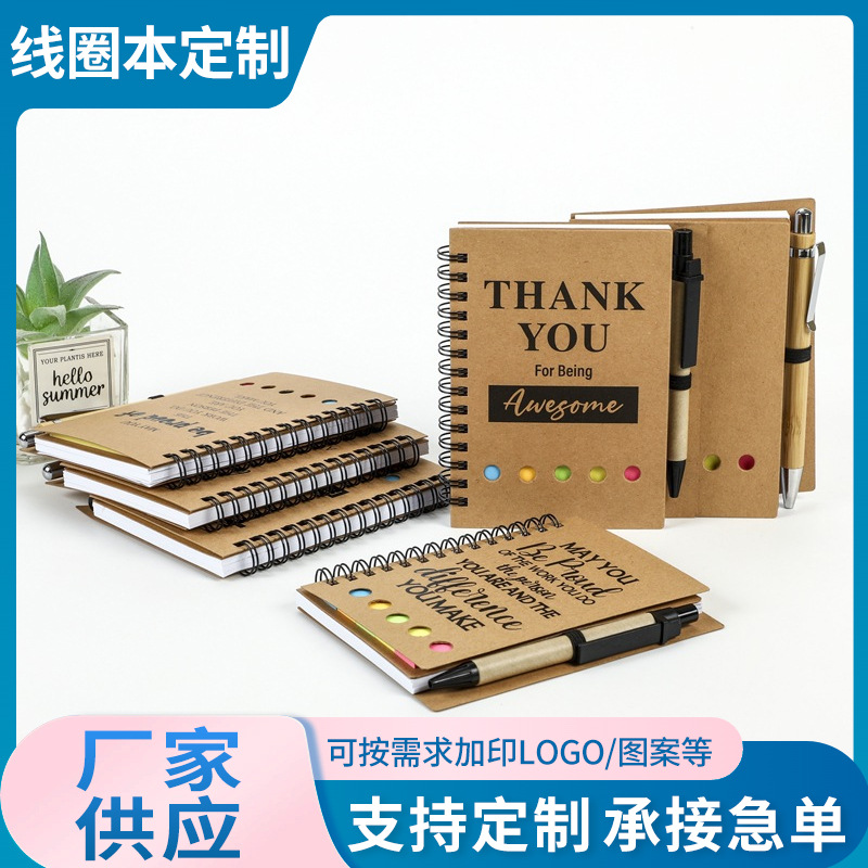 シンプルでファッショナブルな付箋コイルノート、カスタマイズされたロゴペンハンギングセット、カスタマイズされた図面付きクラフト紙コイルノート