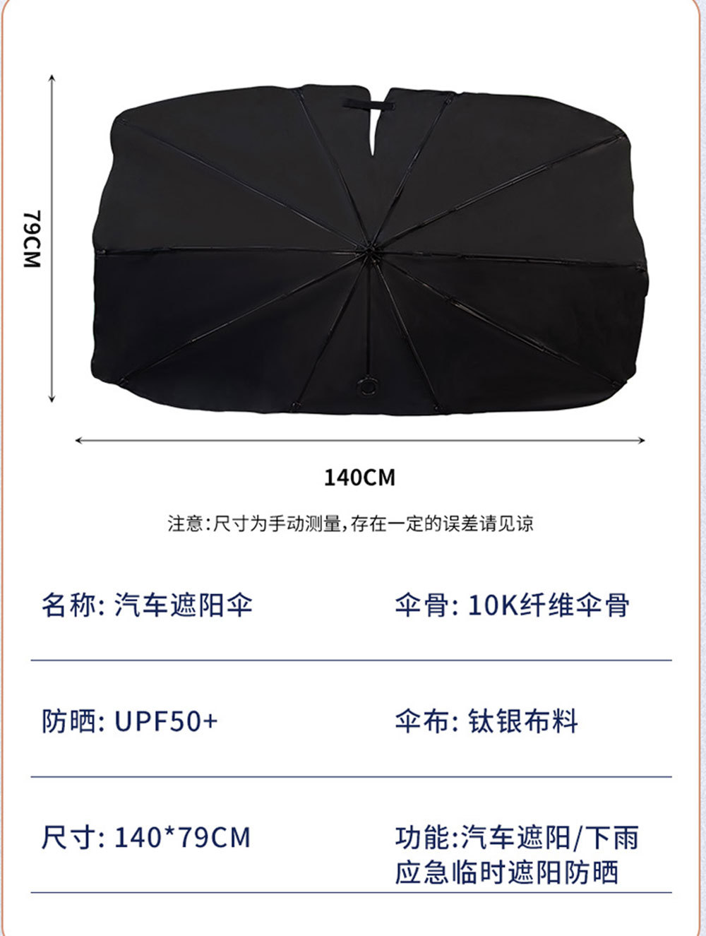 【选款提示】:遮阳伞更适用于常规型车辆;大号140*80cm,小号125*65cm。常规三厢五座式轿车型\紧凑SUV车型推荐选择大号尺寸,小号是两厢两座式迷你车型使用的。