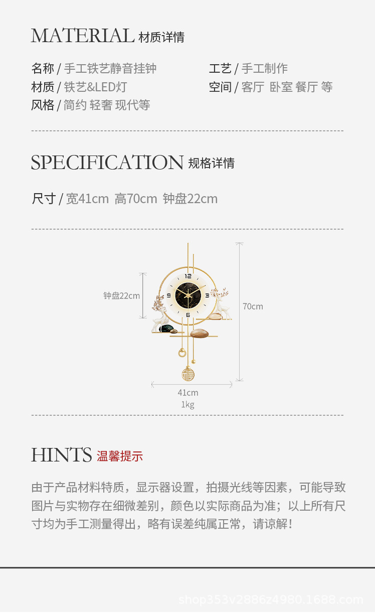 クリエイティブ掛け時計客間現代シンプル芸術静音時計家庭用軽量贅沢大気時計壁灯グリル装飾