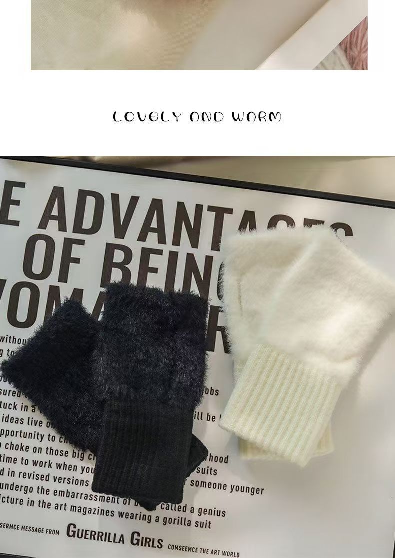 保暖防寒手套女秋冬女ins水貂绒毛绒黑白色可爱办公半指学生手套