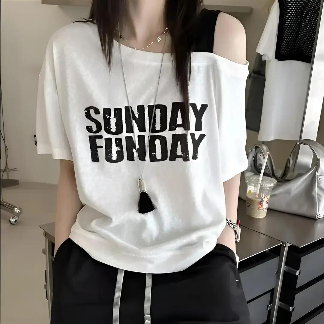 设计感时尚露肩短袖T恤女2025夏宽松显瘦减龄小个子字母印花上衣