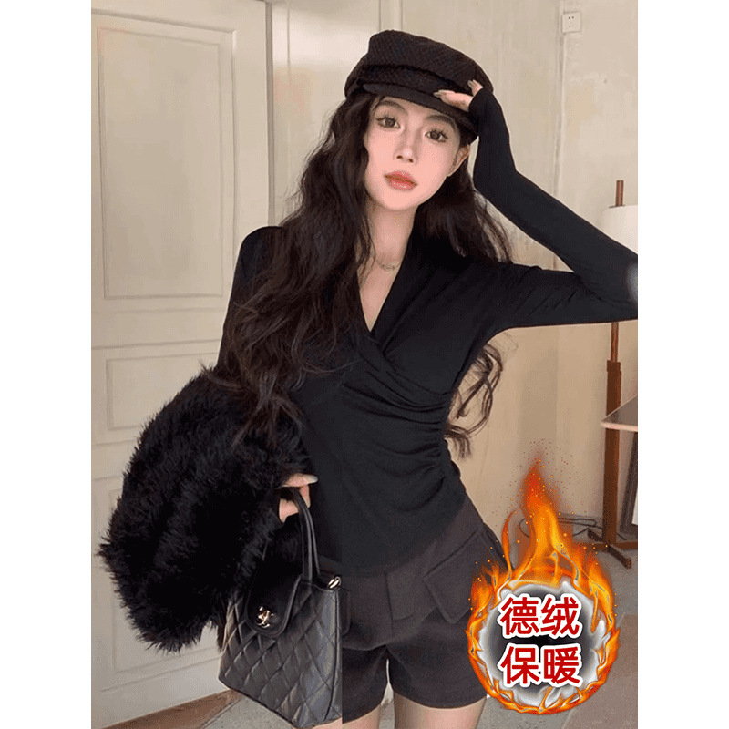 收腰褶皱交叉V领德绒打底衫女秋冬新款法式高级感修身长袖T恤上衣