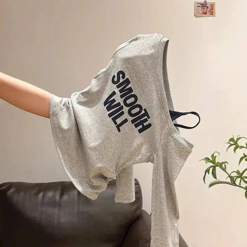 字母印花一字斜肩长袖T恤女秋季新款美式辣妹收腰显瘦假两件上衣
