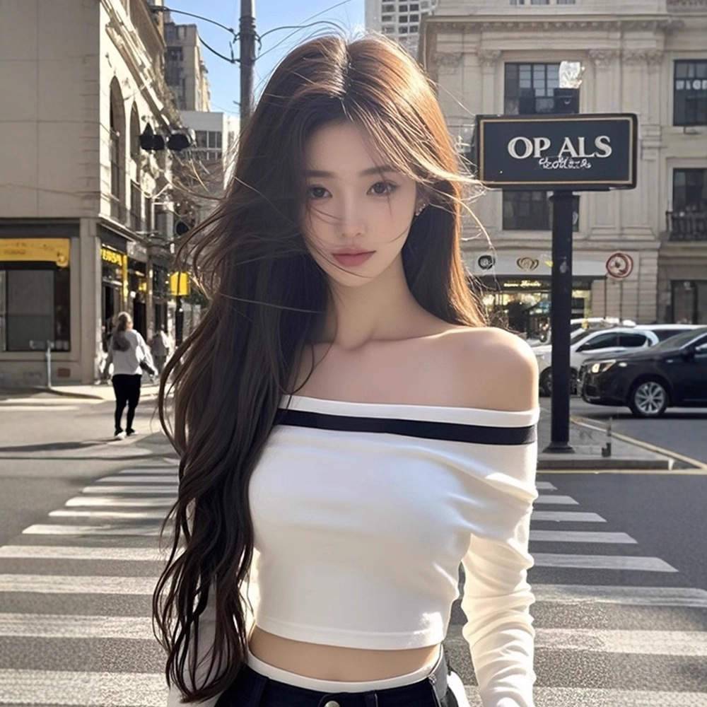 独特别致白色甜辣妹一字肩打底衫女设计感小众修身超好看露脐上衣
