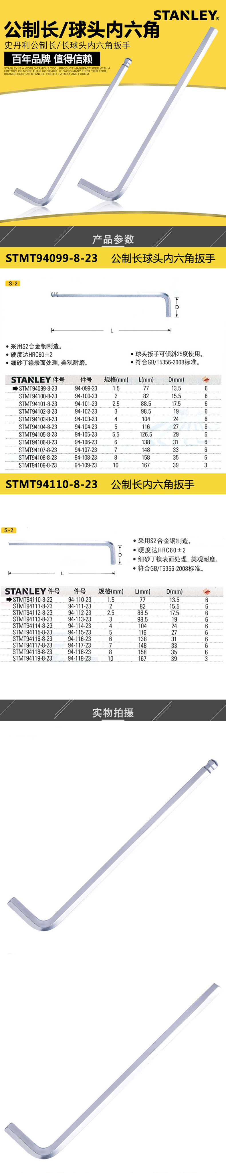 スタンレー シングルロングボールヘッドフラットヘッド六角レンチ 1.5/2/2.5/3/4/5/5.5/6/7/8/10mm