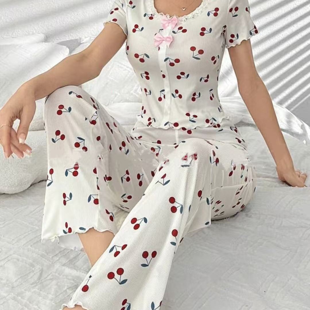 家居服短袖长裤休闲舒适跨境小樱桃女士睡衣两件套蝴蝶结白色夏季