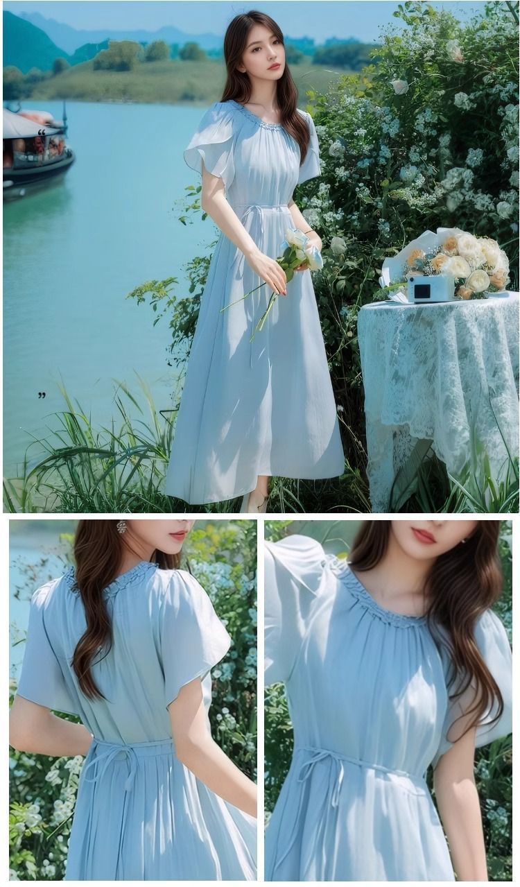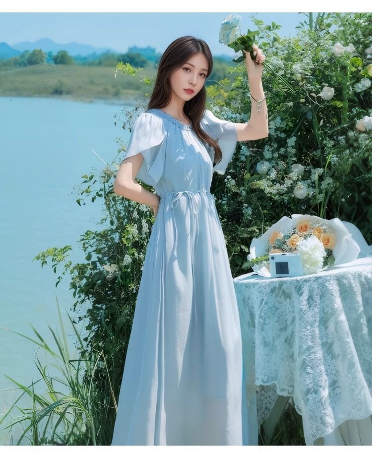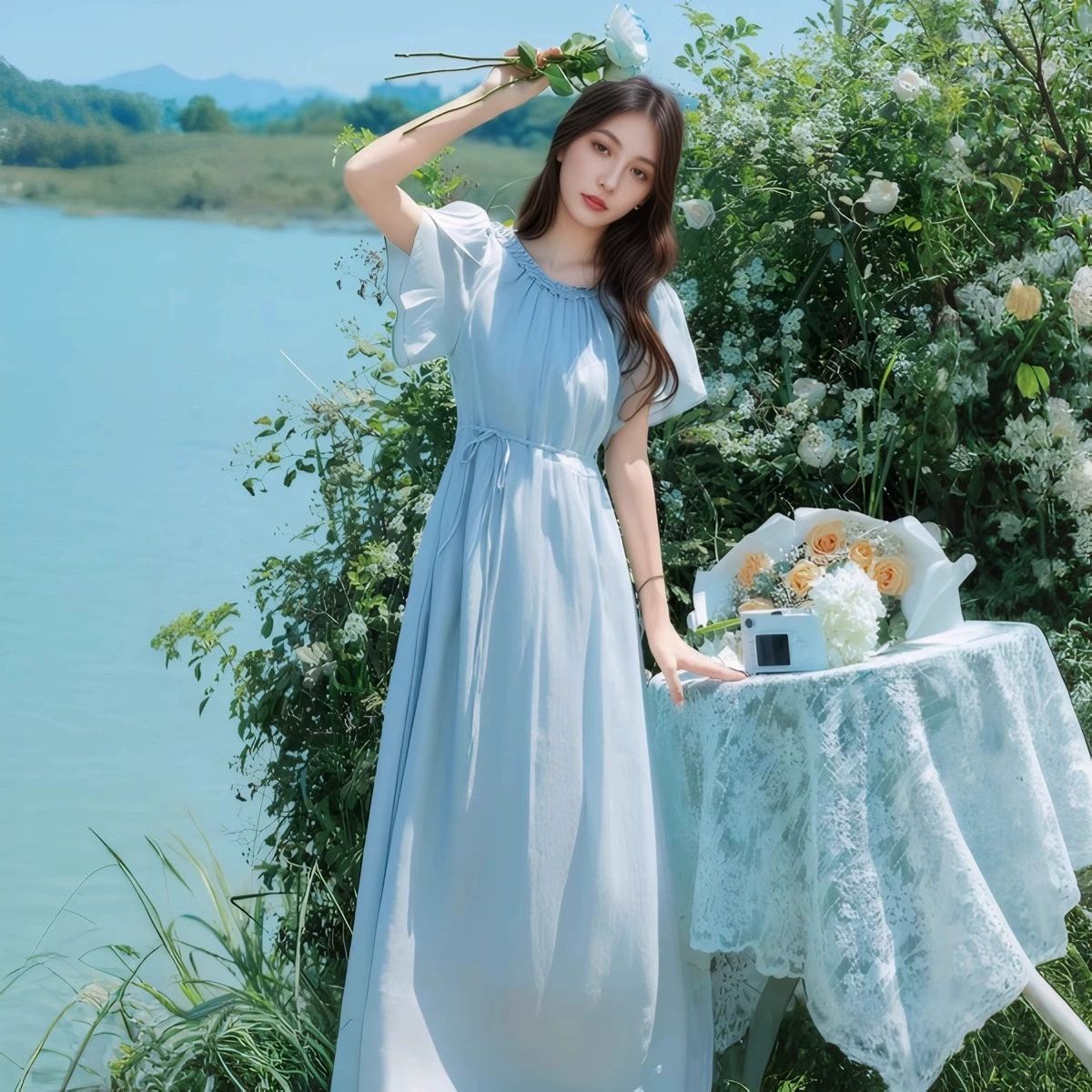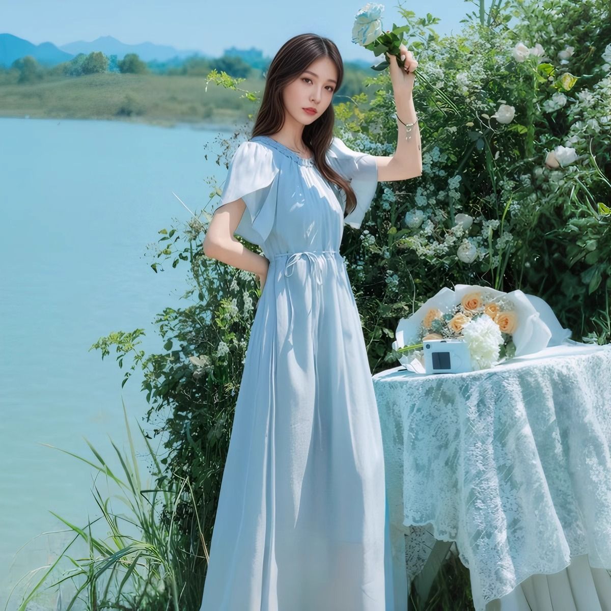 夏の新しいドレスフレンチスイートペタルスリーブハイウエストレースアップスリムドレスデザイン気質ロングスカート