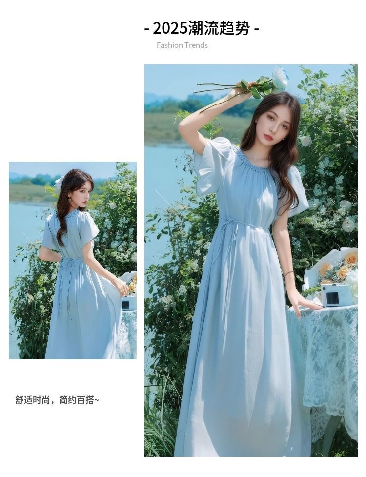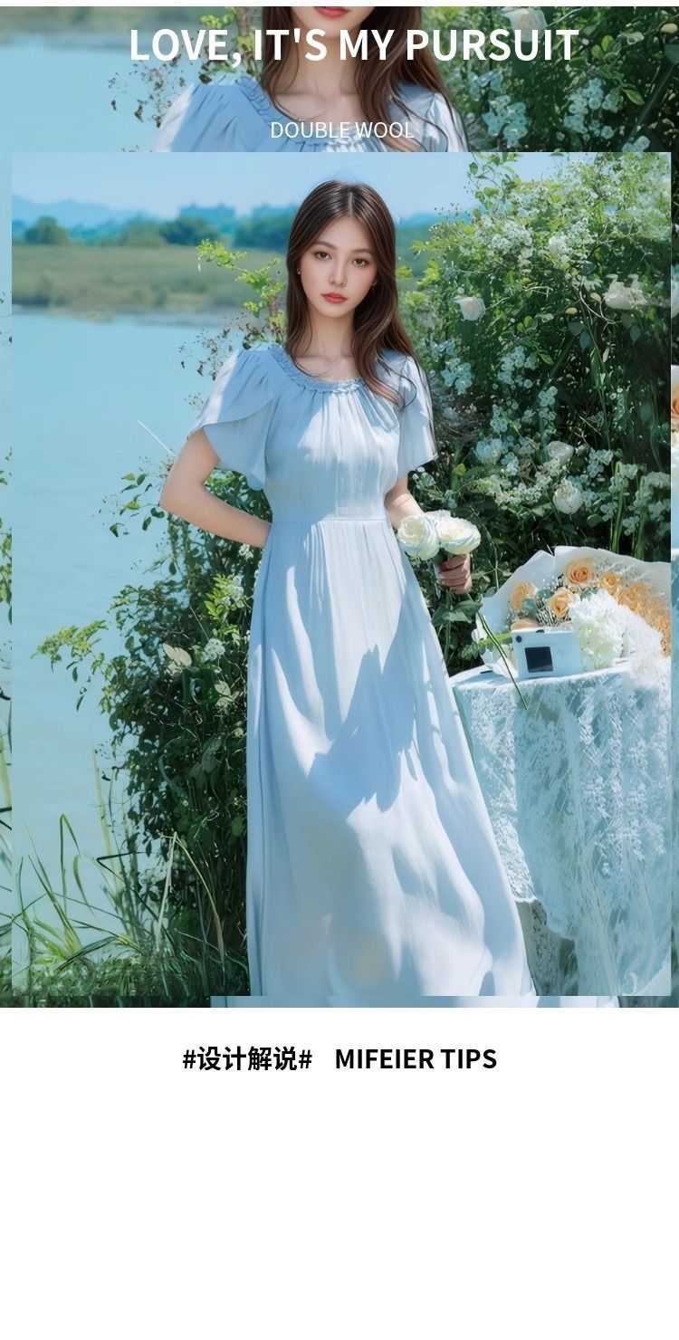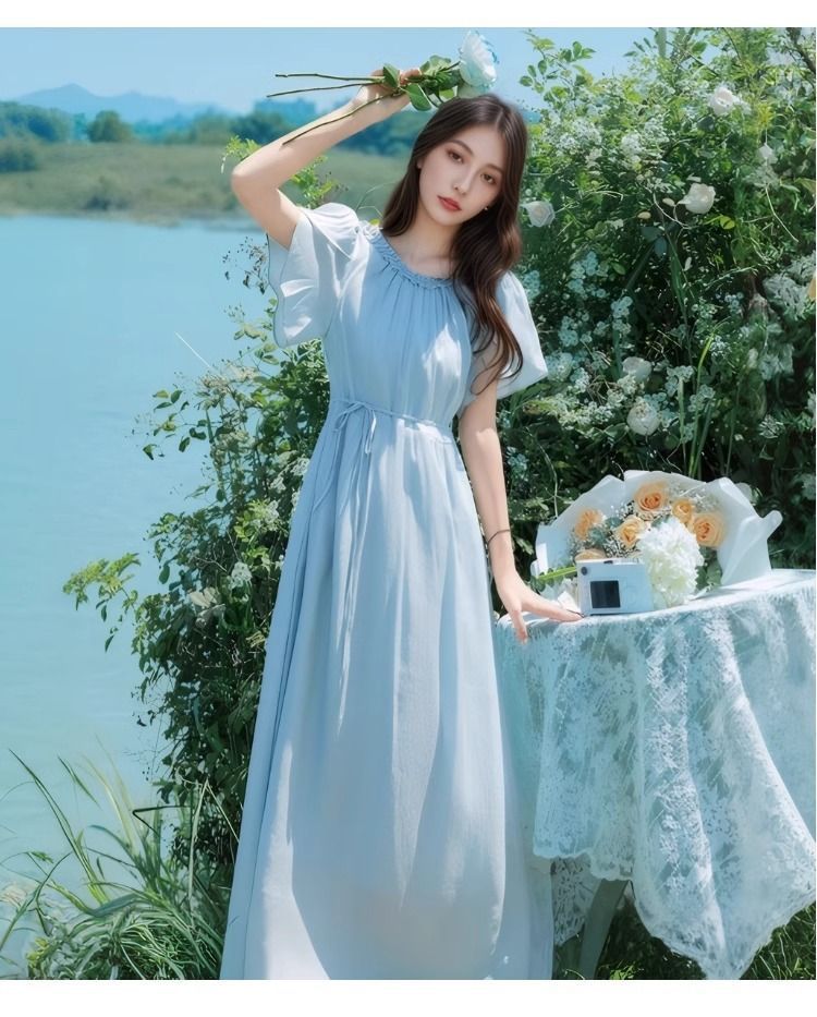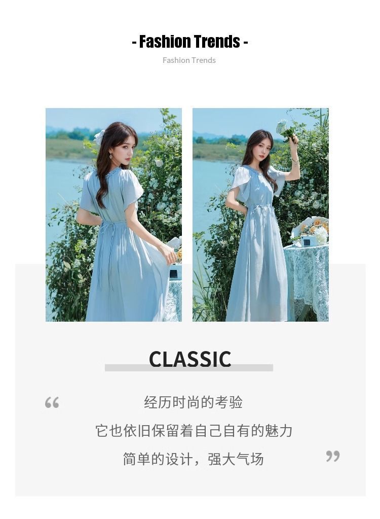 夏の新しいドレスフレンチスイートペタルスリーブハイウエストレースアップスリムドレスデザイン気質ロングスカート