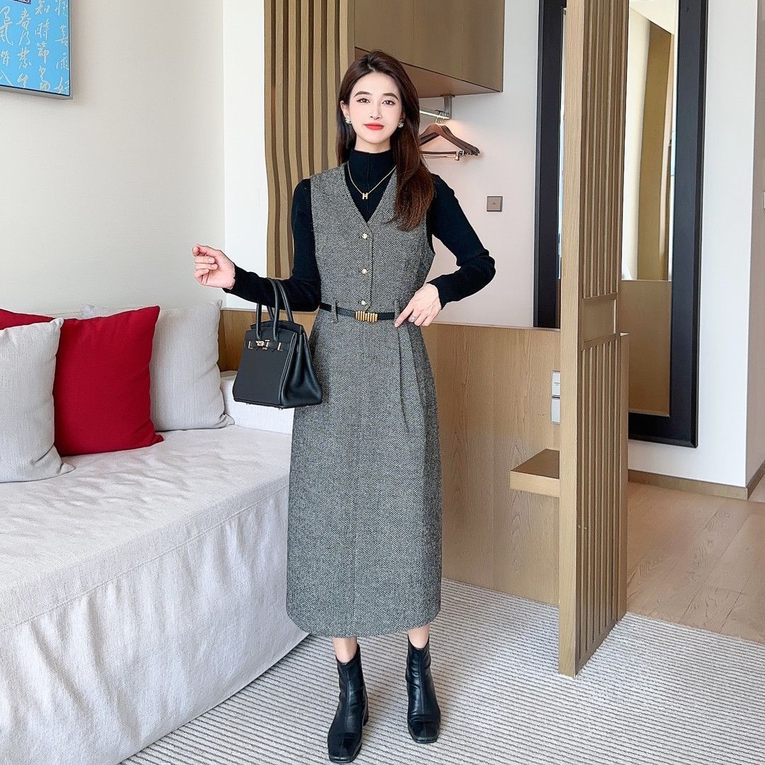 9318 春と秋のファッションドレス、軽くて豪華なミドル丈の香りのウールのベストスカート、ウエスト痩身ベストスカート