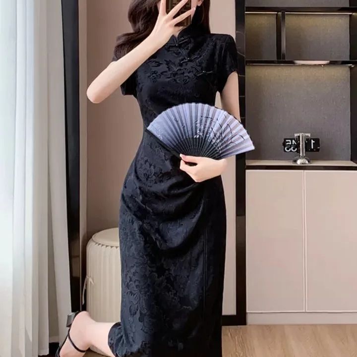 9397 ブラックジャカードスタンドカラーチャイナドレス 2025 夏の新国民風バックル気質スリムロングスカート