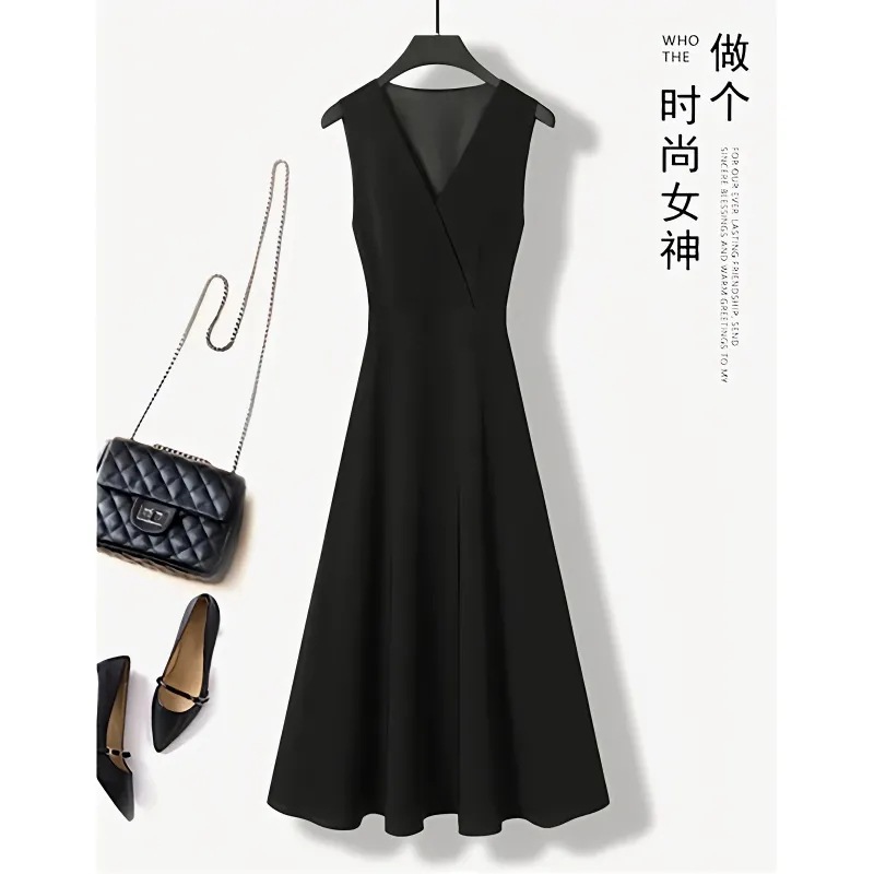 9050小香風馬甲ワンピース女性春秋高級感気質修身長スカートノースリーブ黒ベストスカート