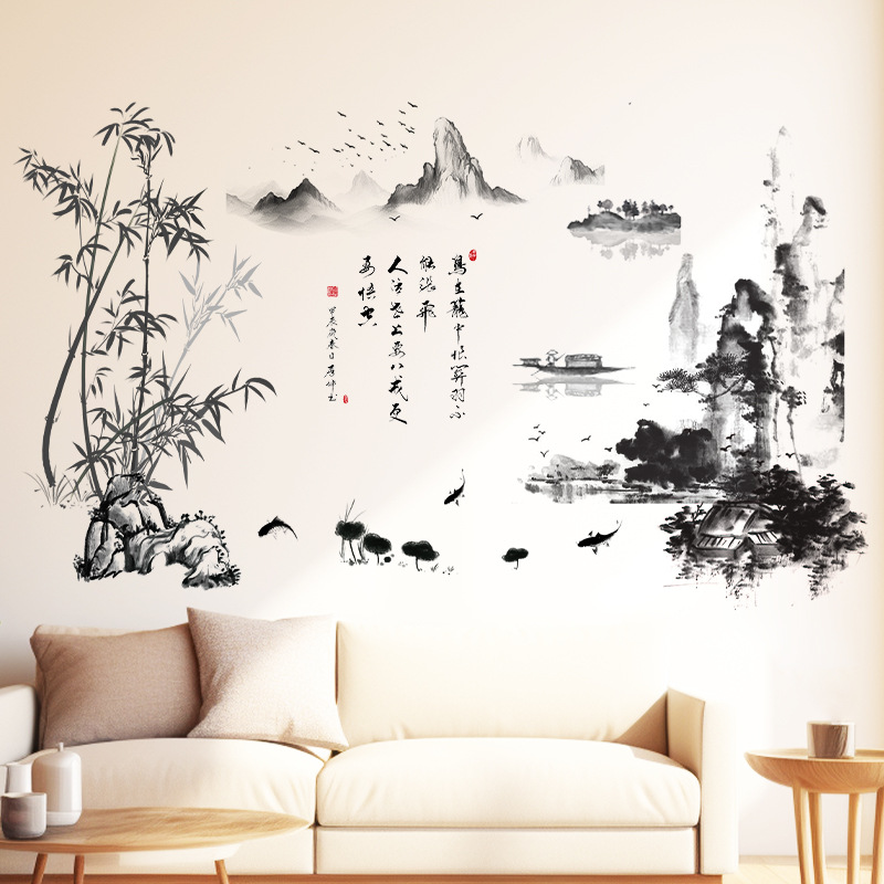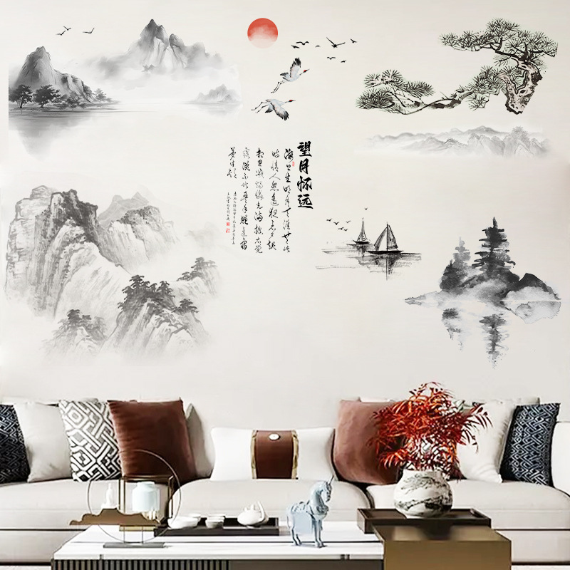 TJ8014中国风山水画墙贴纸客厅沙发电视背景墙装饰自粘墙壁贴画