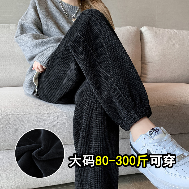 大码胖mm华夫格束脚运动裤女秋冬加绒宽松显瘦梨形身材九分休闲裤