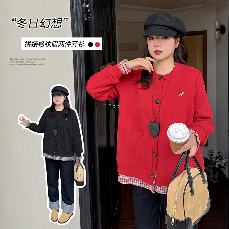 Eno プラスサイズの女性のスプライシングチェック柄偽ツーピースカーディガン女性の冬の新しいスリムトップ 111980