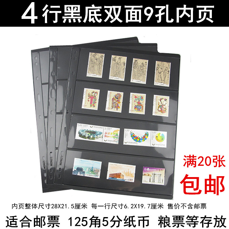 黒背景の両面切手コレクション用の4行ルーズリーフ、125コーナー紙幣インナーコア、紙幣コレクションブック、小さなスタンプの空ページ