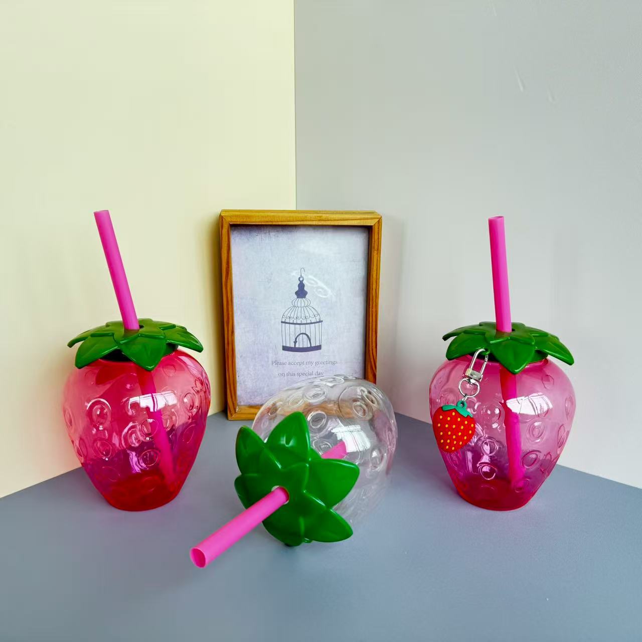 透明なイチゴカップ,ピンクのストロベリーカップ,透明ストロベリーカップ+ペンダント,ピンクのストロベリーカップ+ペンダント,透明なイチゴとペンダントとライト,ライトとペンダントが付いたピンクのイチゴ