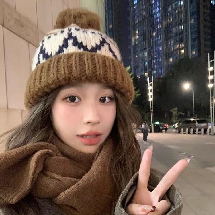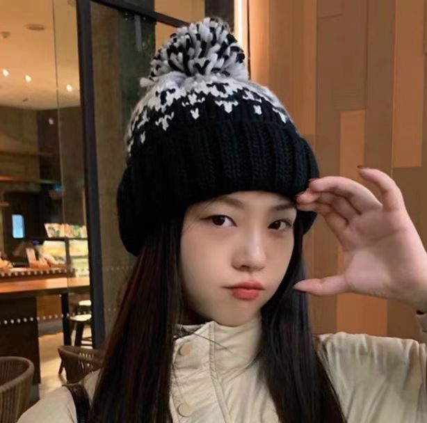 毛线帽冬季女加厚保暖粗毛线针织帽冬天防寒护耳方圆脸提花毛球帽