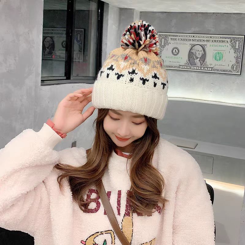 毛线帽子提花韩版秋冬天防风保暖帽子大头围毛球显脸小圣诞针织帽