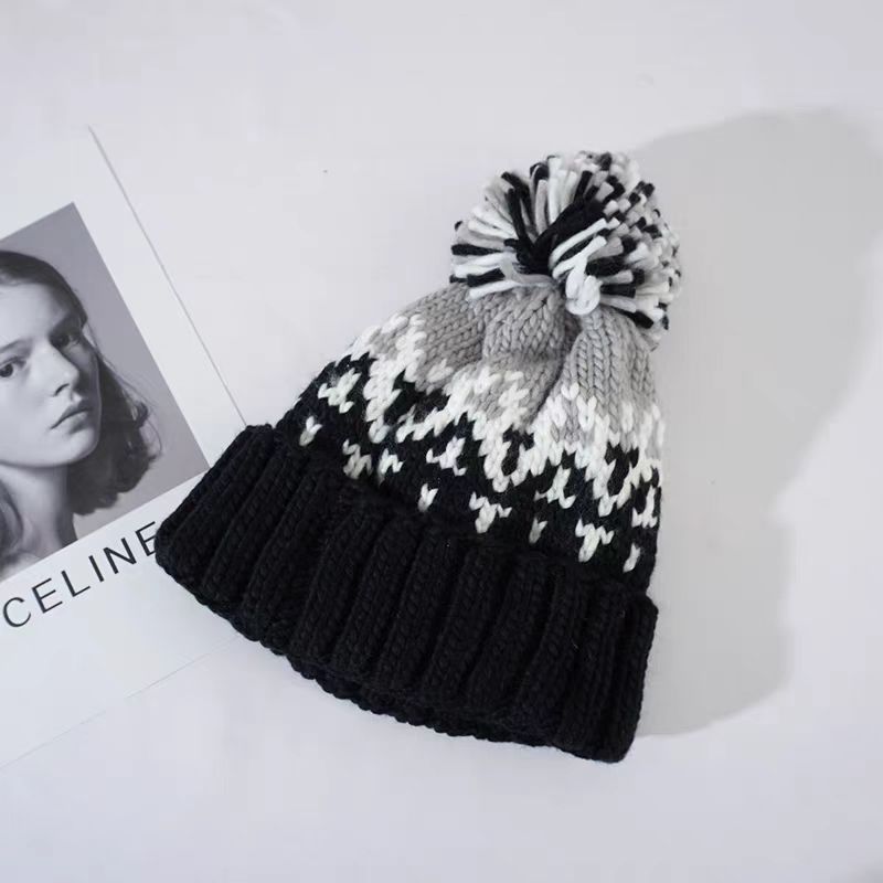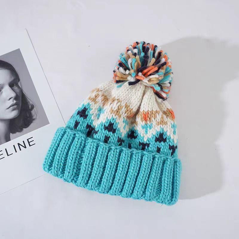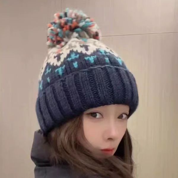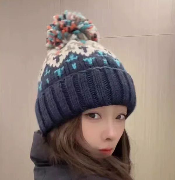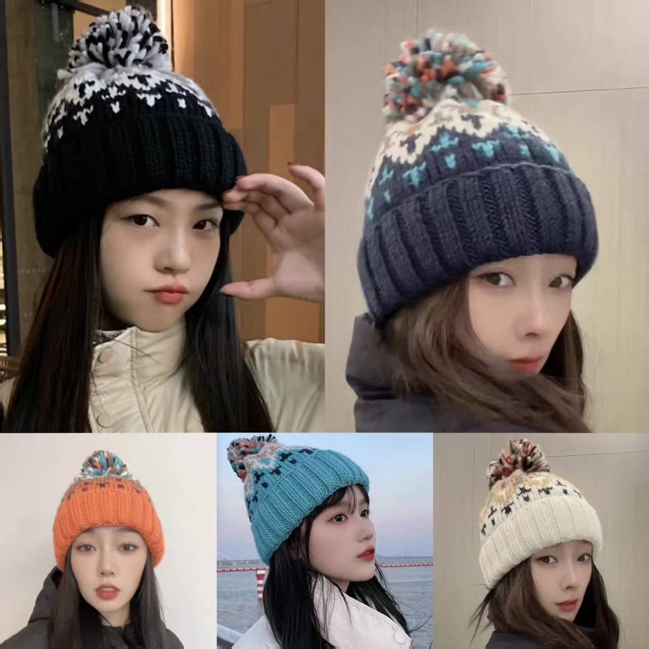 秋冬季新款毛线帽女费尔岛时尚护耳针织帽韩系百搭彩色加厚毛球帽
