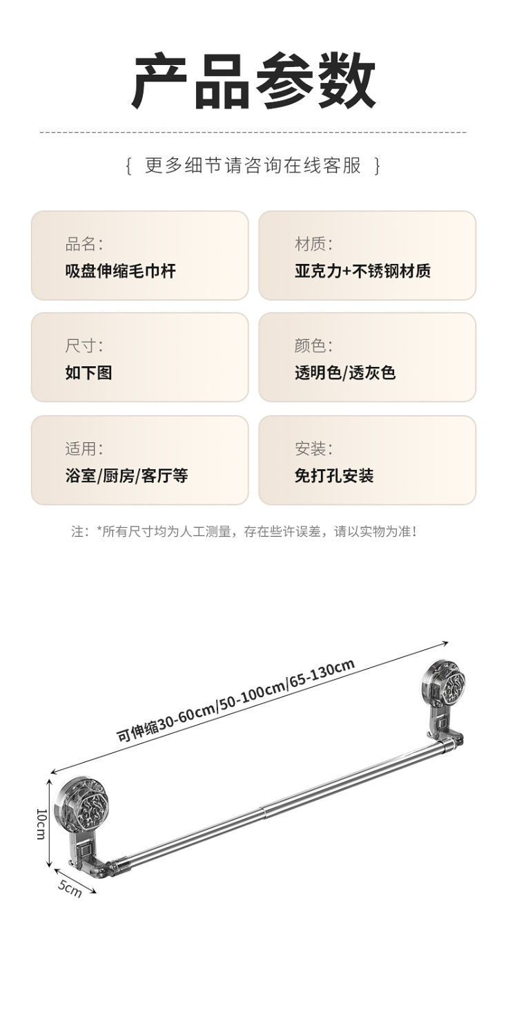 サイズ 吸盤伸縮タオルハンガー ガングレー 30-60cm,吸盤伸縮タオルハンガー ガングレー 50-100cm,吸盤伸縮タオルハンガー ガングレー 65-130cm,吸盤伸縮タオルハンガー 透明色 30-60cm,吸盤伸縮タオルハンガー 透明色 50-100cm,吸盤伸縮タオルハンガー 透明色 65-130cm