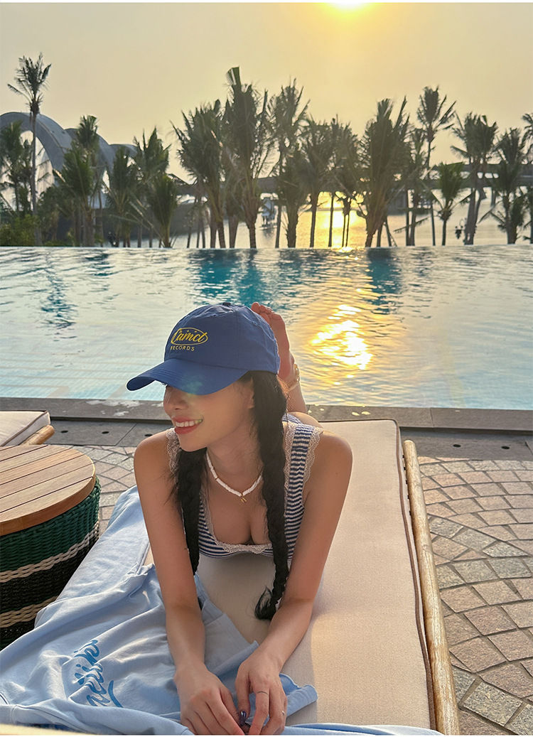 ブルー水着レディーススプリットストライプレトロワンピースビキニ小胸プッシュアップサスペンダー温泉ウェア2025新スタイル