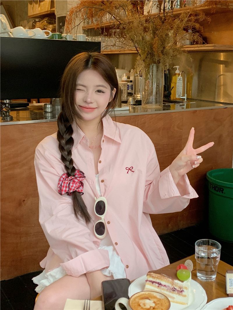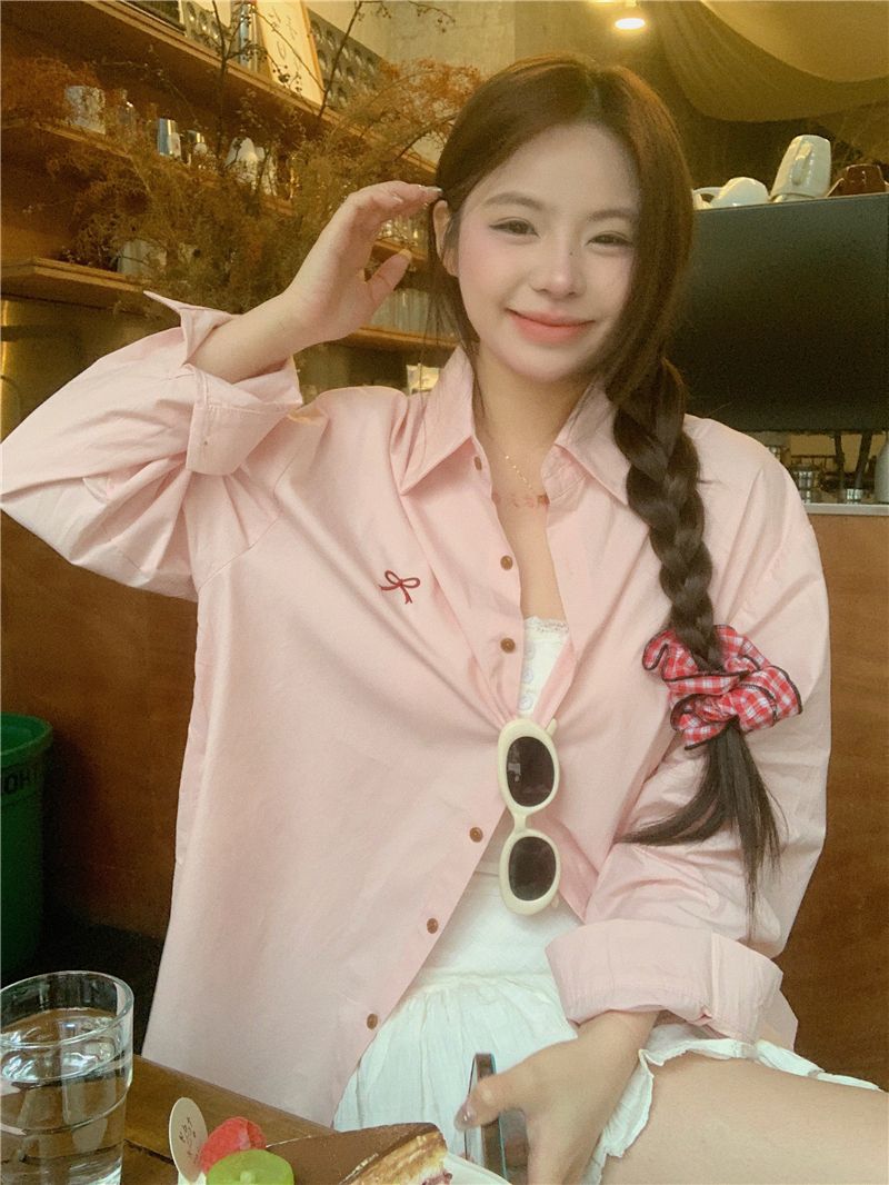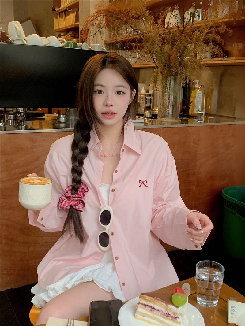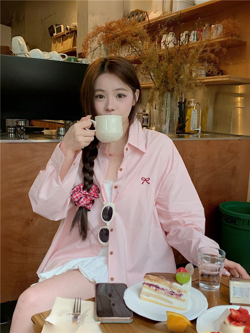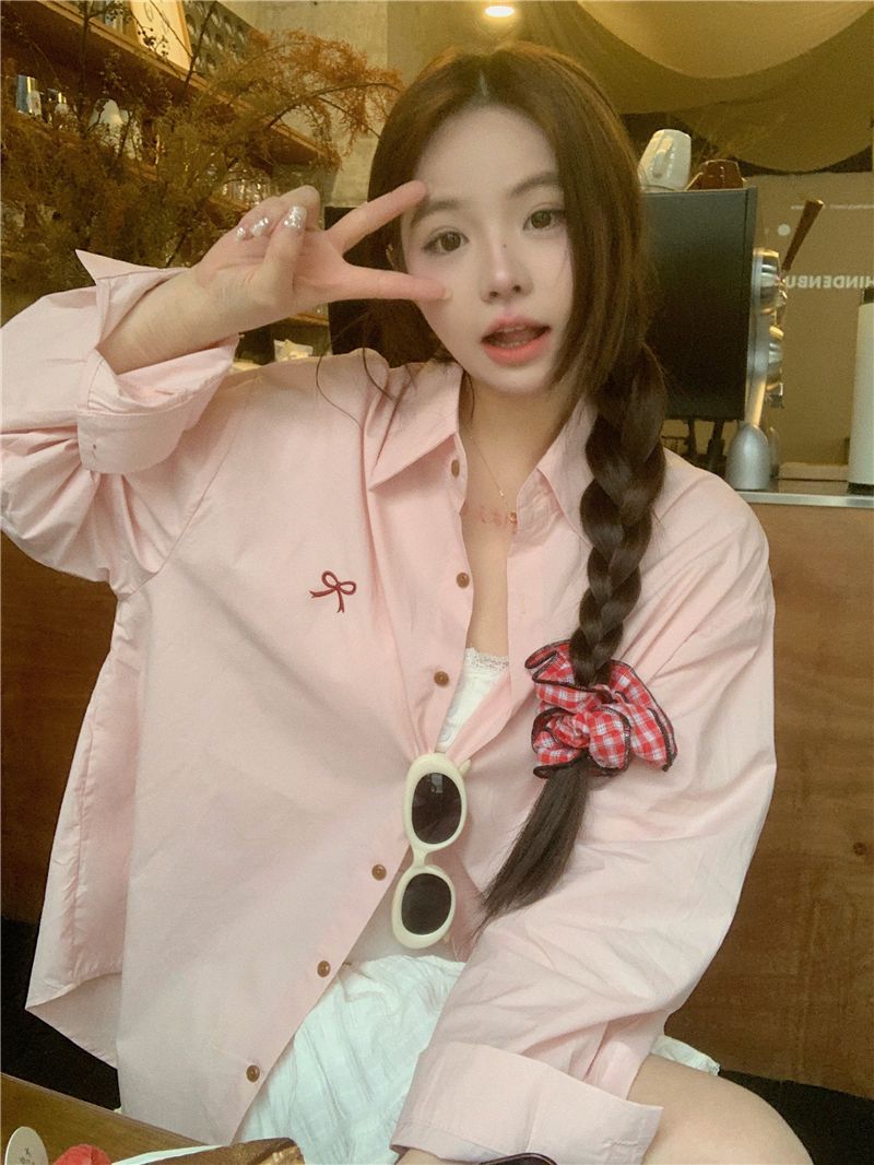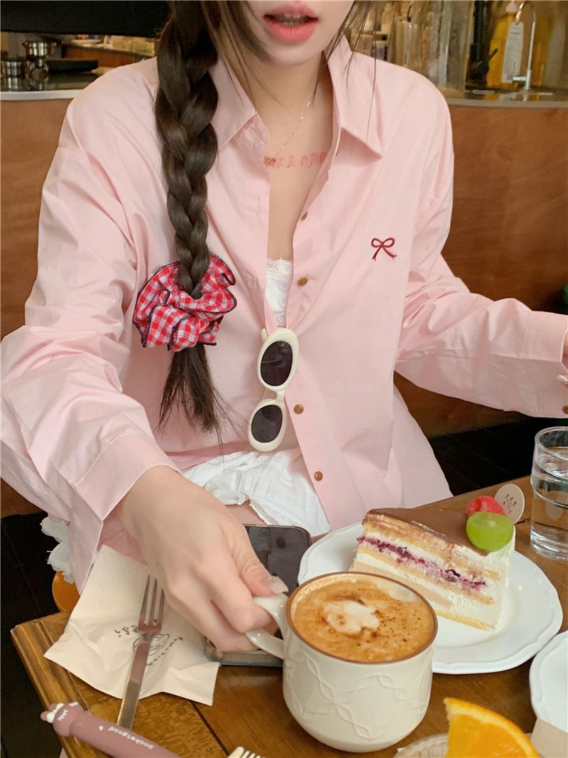 優しいピンクのリボン刺繍ポロカラーシャツ女性のための 2025 春の新しいルーズカジュアル長袖トップ