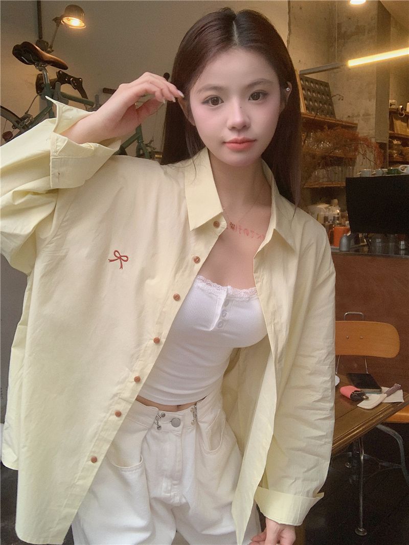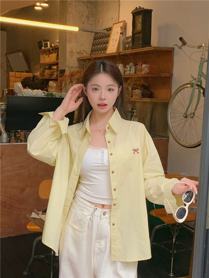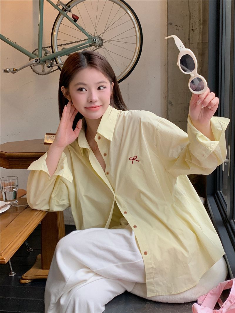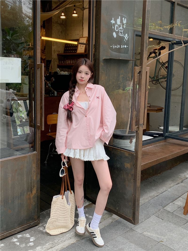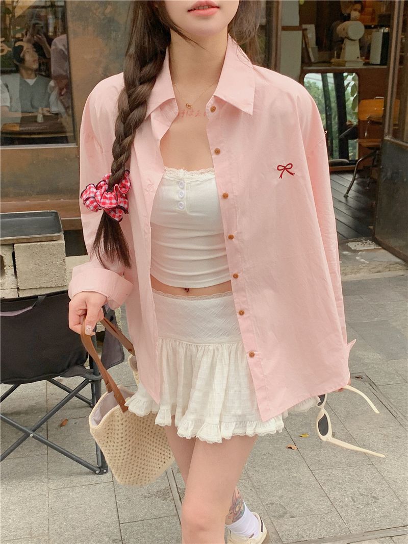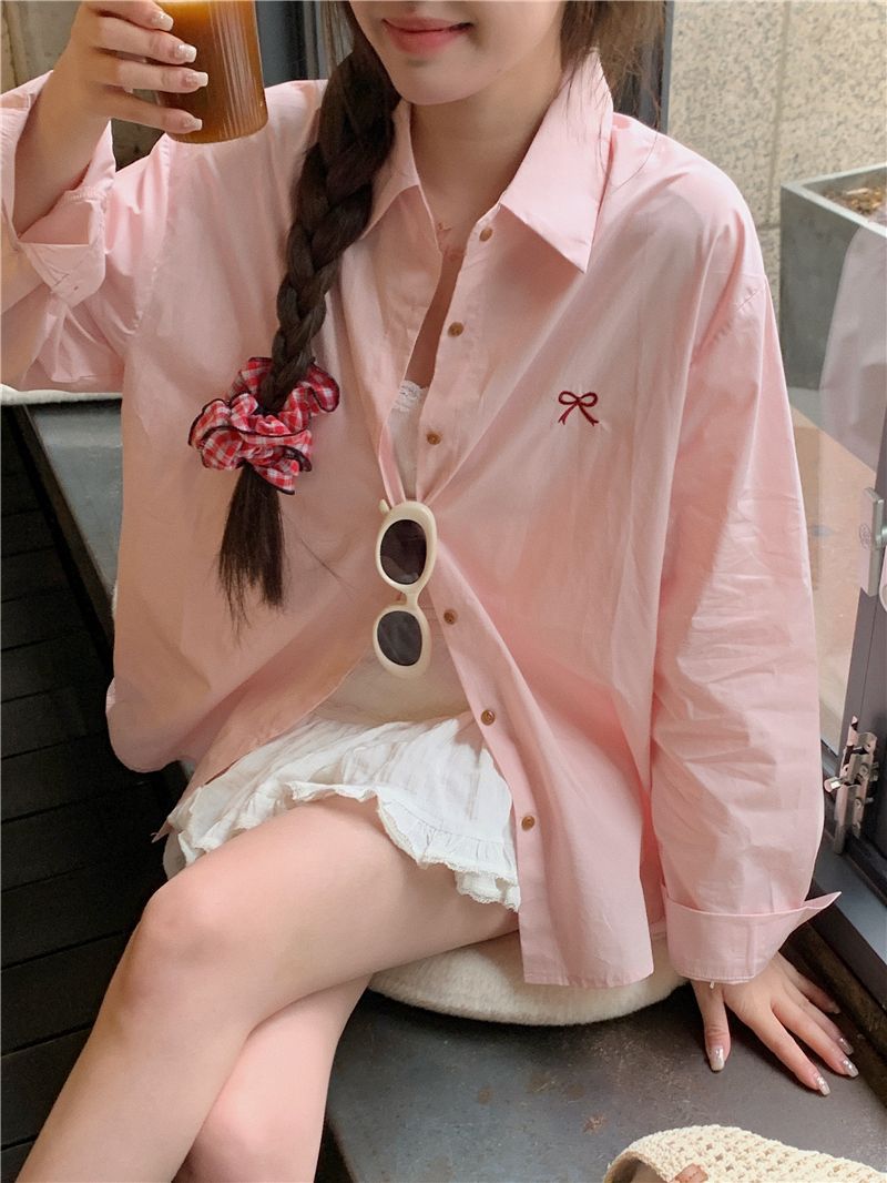 優しいピンクのリボン刺繍ポロカラーシャツ女性のための 2025 春の新しいルーズカジュアル長袖トップ