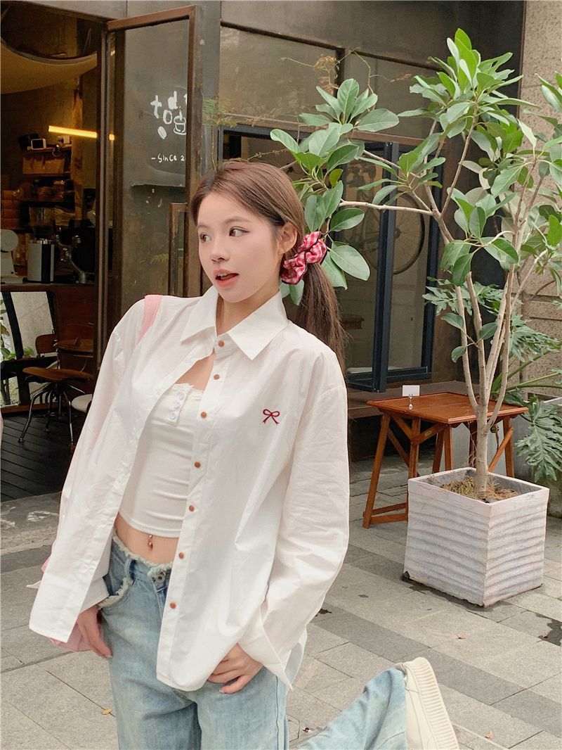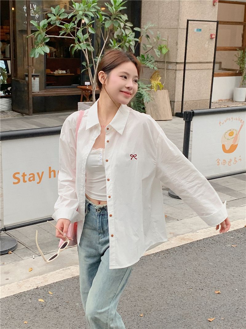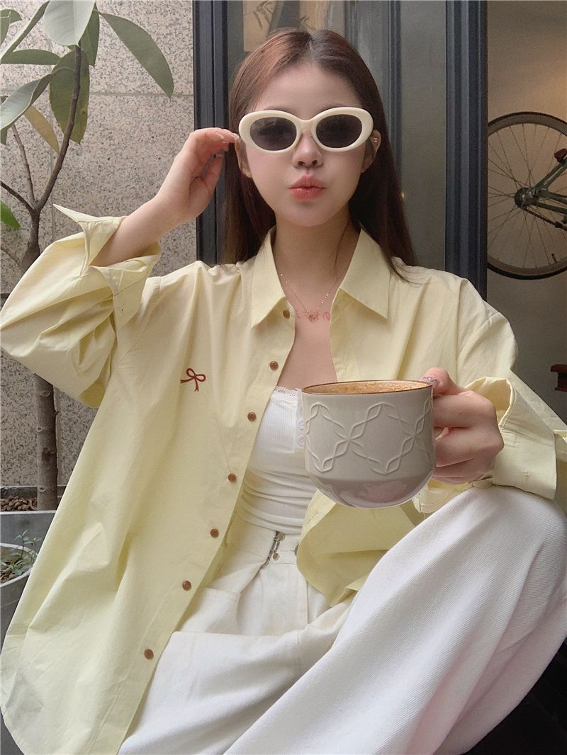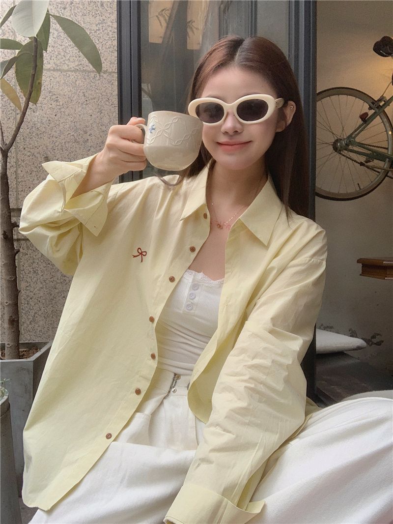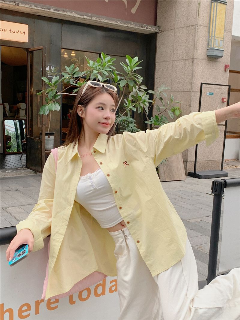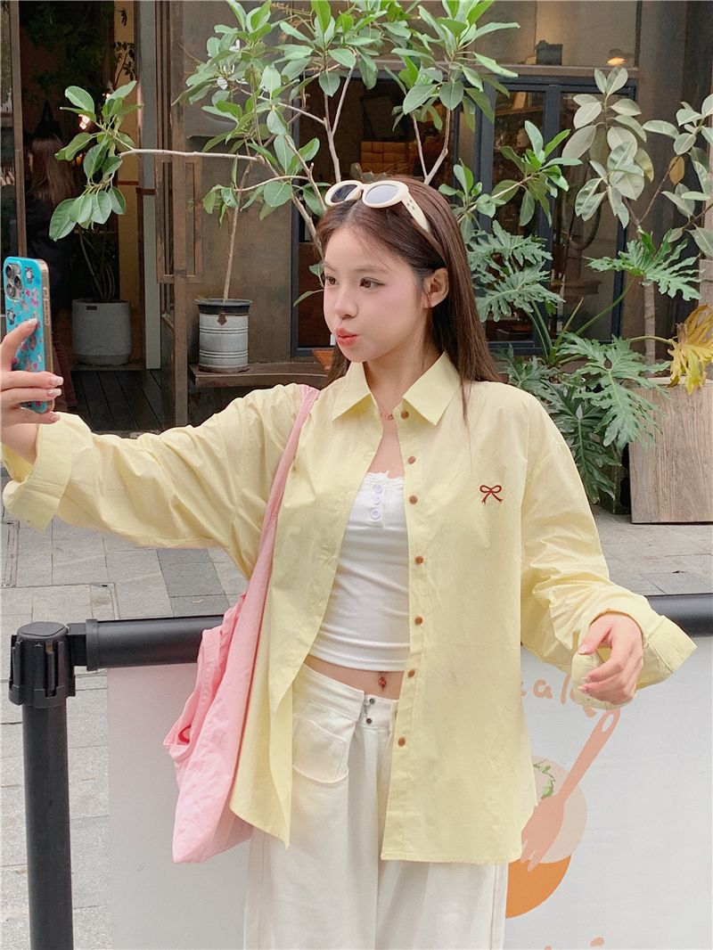 優しいピンクのリボン刺繍ポロカラーシャツ女性のための 2025 春の新しいルーズカジュアル長袖トップ