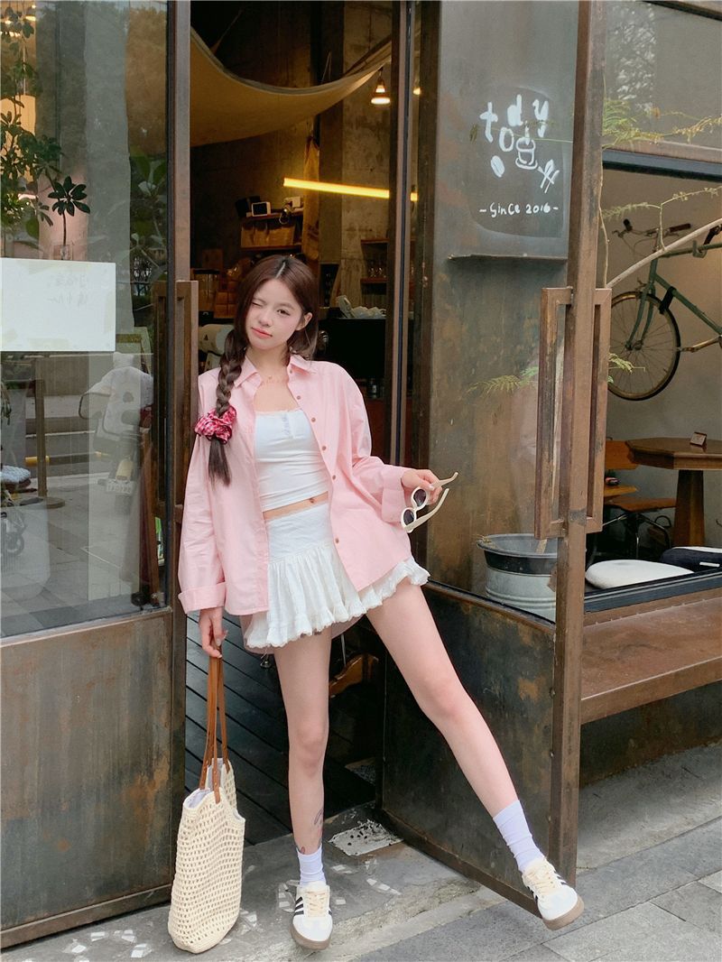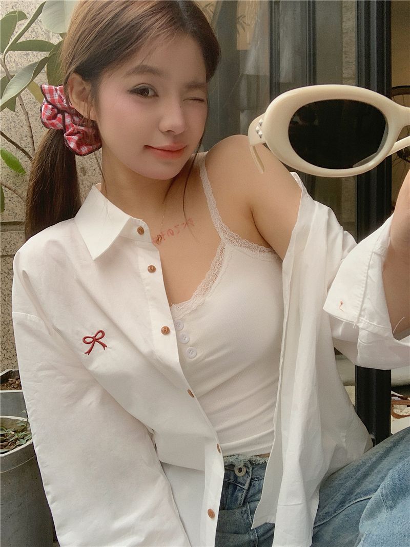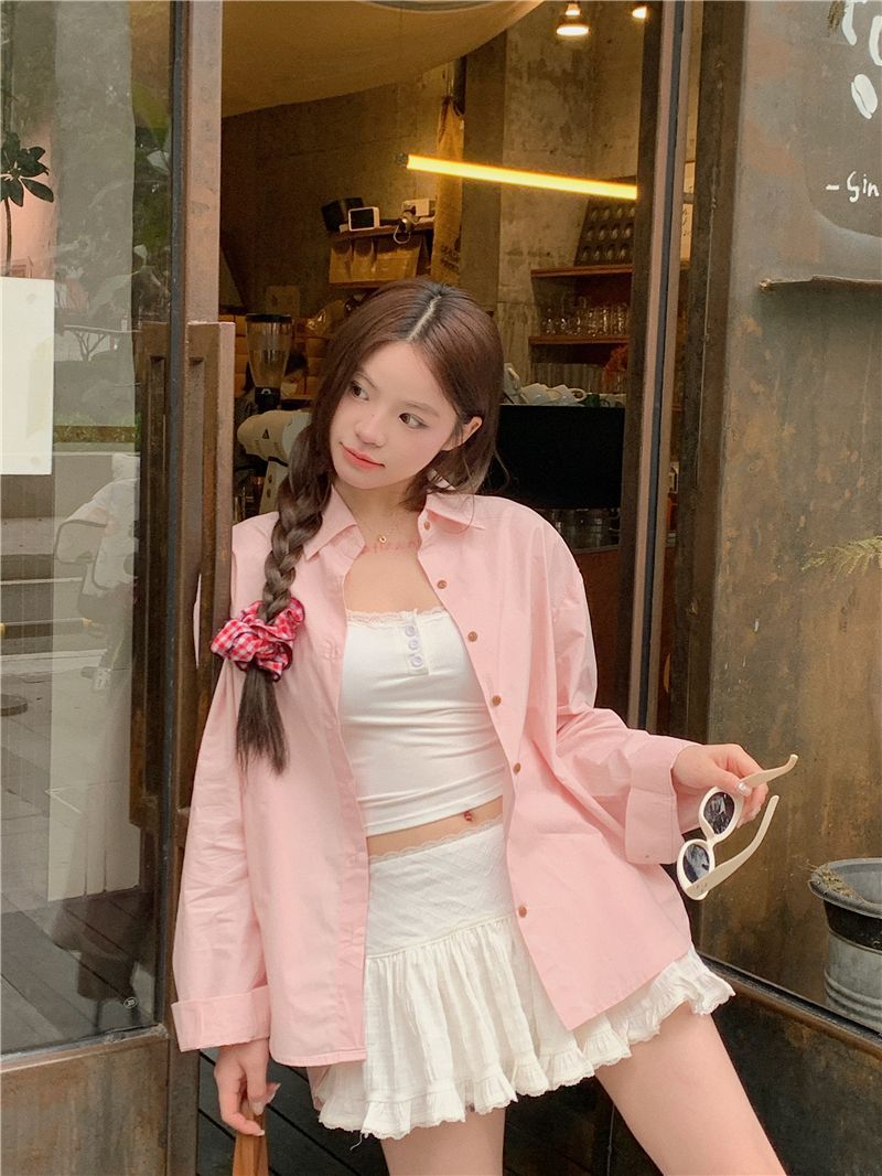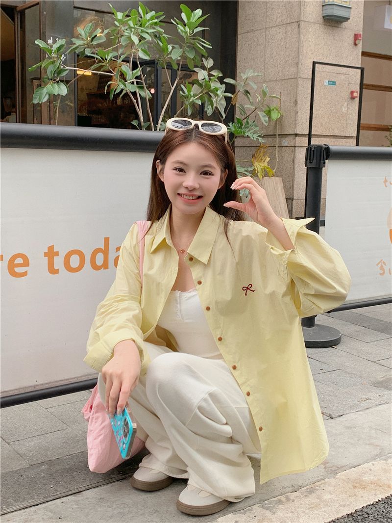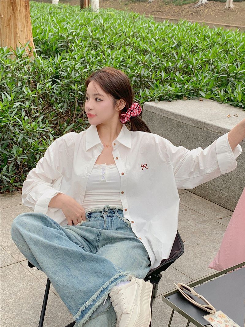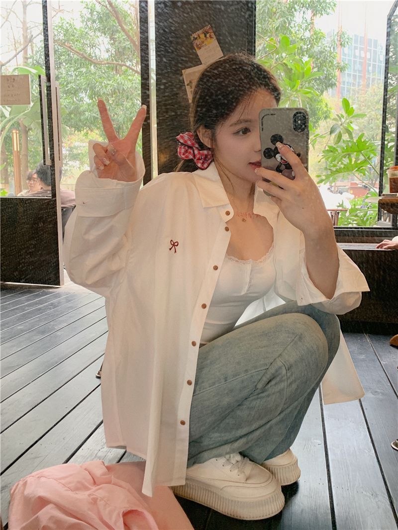 優しいピンクのリボン刺繍ポロカラーシャツ女性のための 2025 春の新しいルーズカジュアル長袖トップ