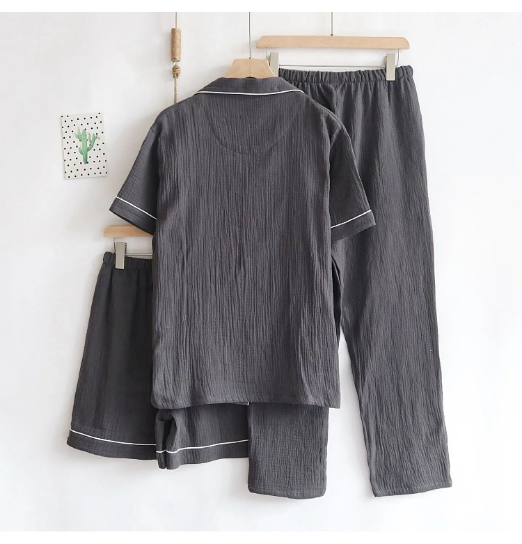 メンズ綿ガーゼパジャマ3点セット春夏純綿二重ガーゼ半袖ズボンショーツ薄手綿ホーム服