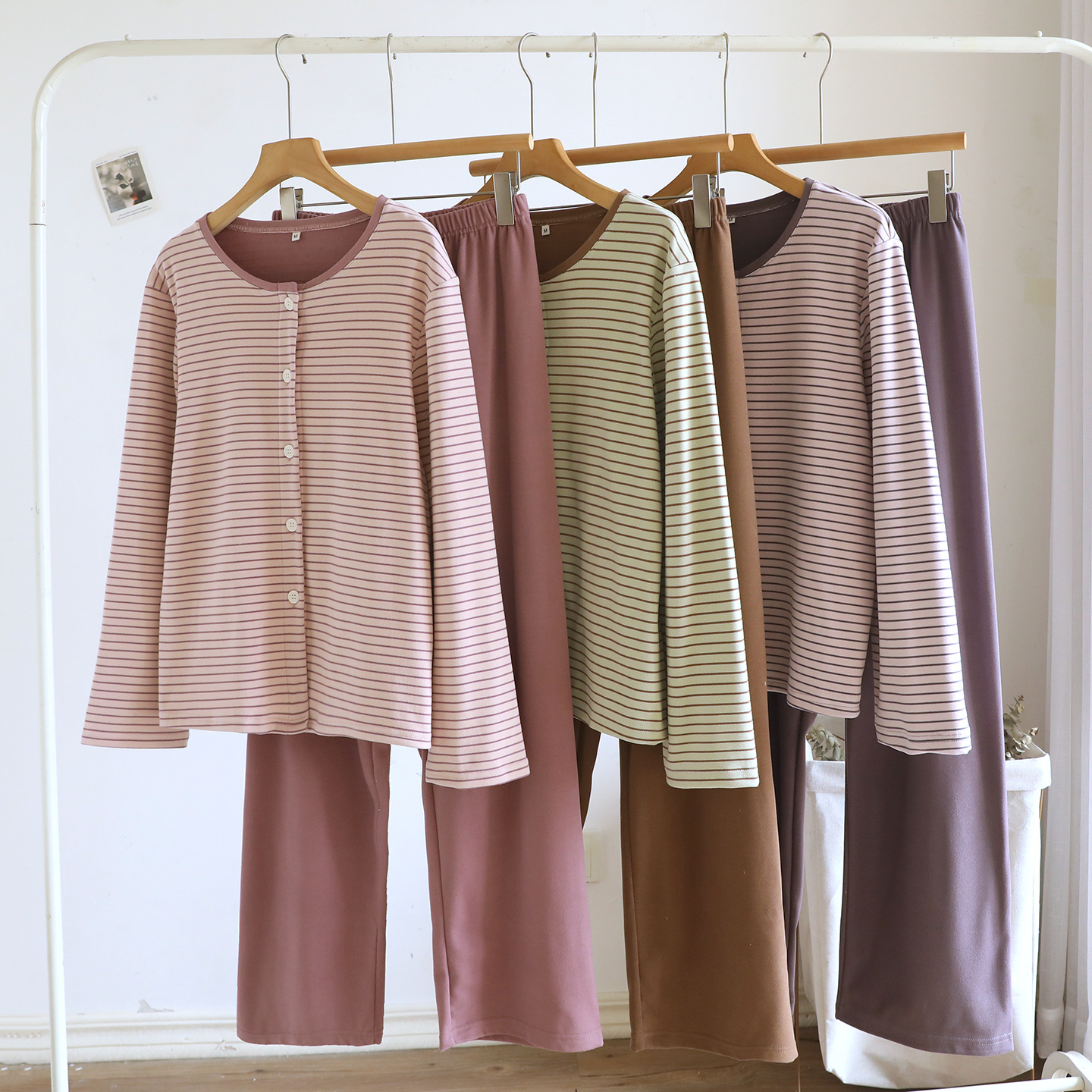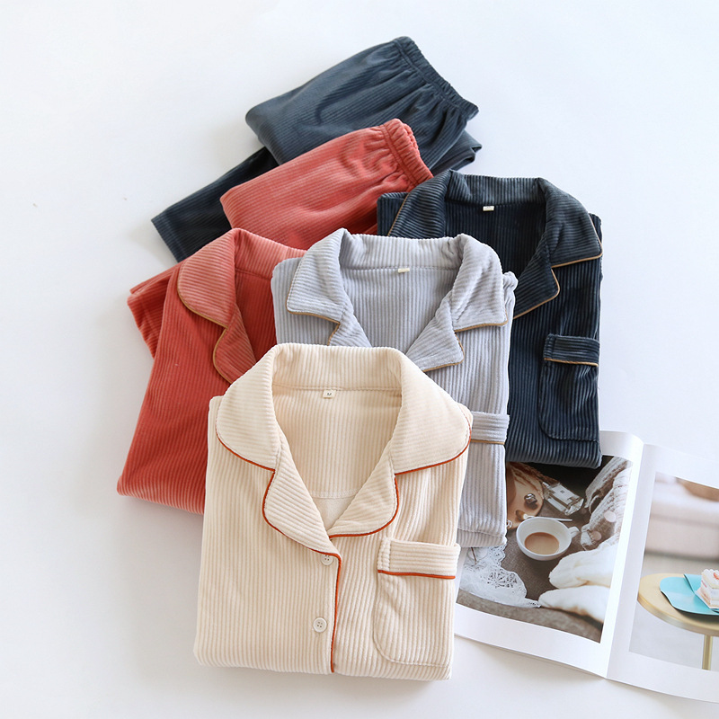 春秋德绒睡衣女士冬季薄绒布磨毛圆领开衫长袖保暖上衣家居服套装