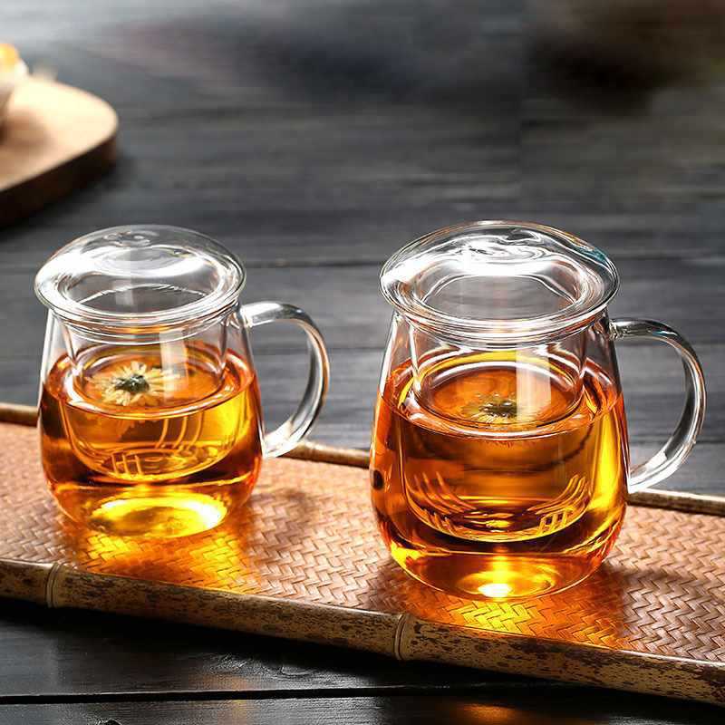 ハンドル付き高ホウケイ酸ガラスカップ、ライナーフィルター付き香り付きティーカップ、オフィスティーカップ、蓋付き3ピースティーカップ