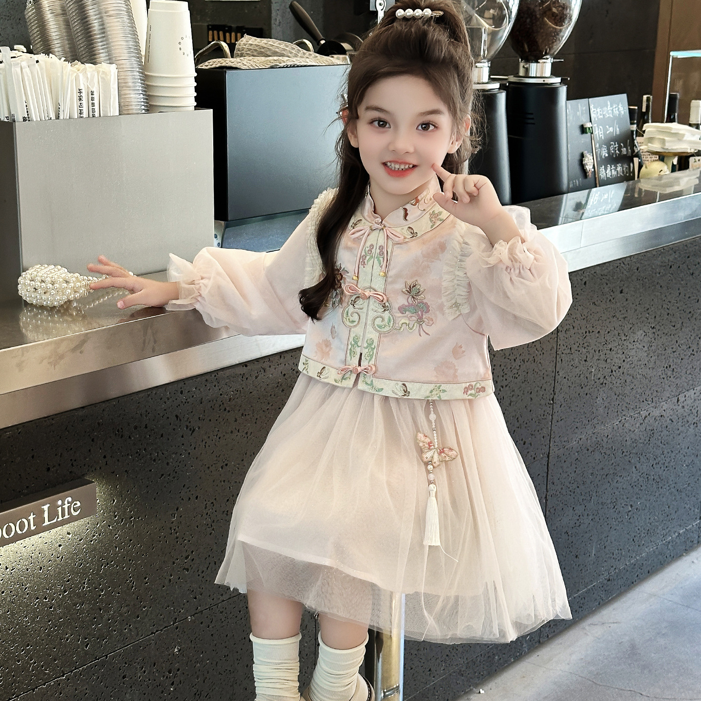 女児漢服2026年新作春服子供用おしゃれな中国風民族衣装春秋用女の子ツーピースセット