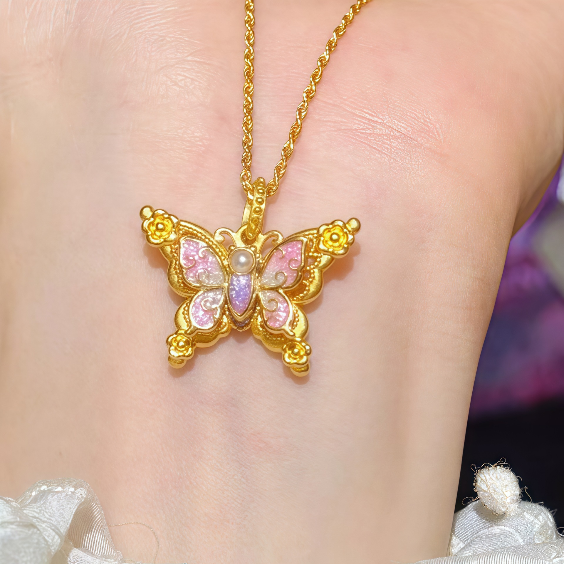 灵动梦蝶项链『翅膀可上下摆动』金店同款珐琅彩色粉色烧蓝锁骨链