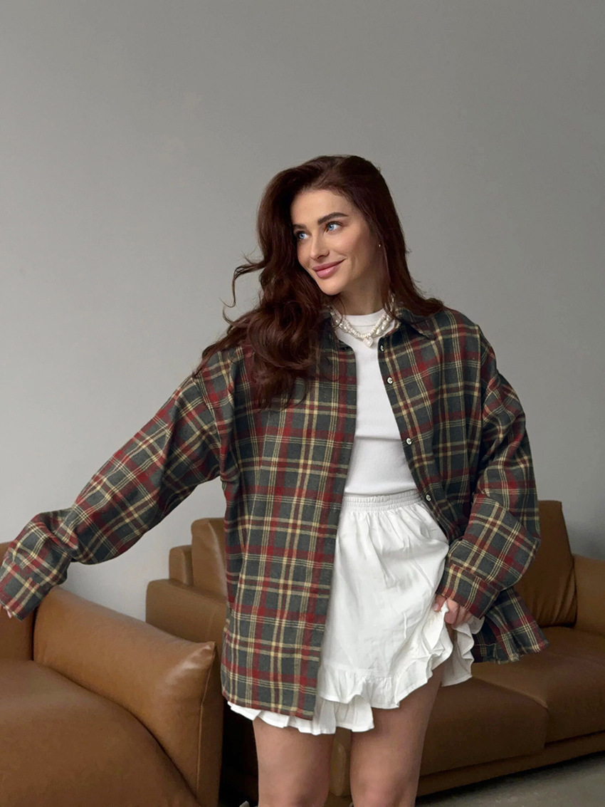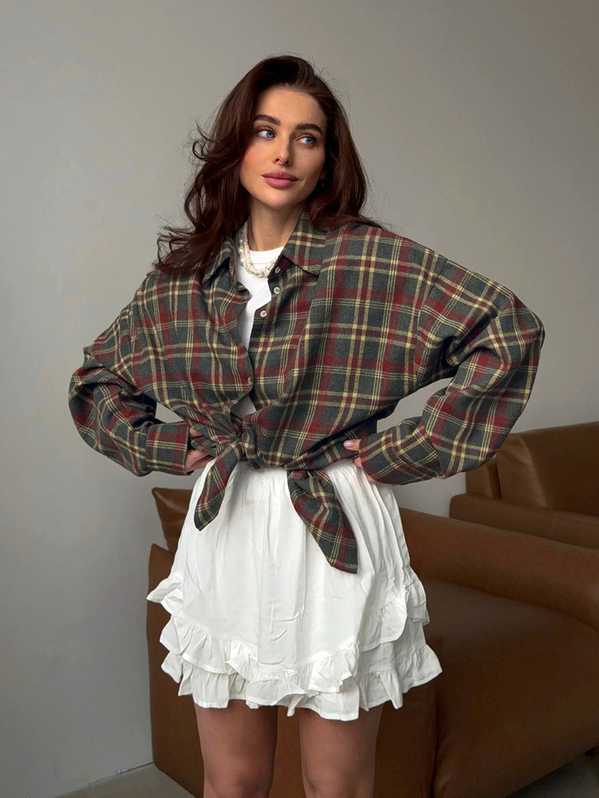 春と秋の新作チェック柄レトロスタイル多用途カジュアルラペル長袖カーディガンシャツヨーロッパとアメリカのポリエステル綿外国貿易シャツ女性用