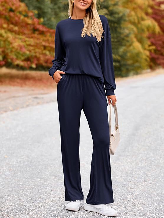 新 2025 女性の 2 点セットラウンドネック長袖トップワイドレッグロングパンツカジュアルセットスポーツウェアホームウェア