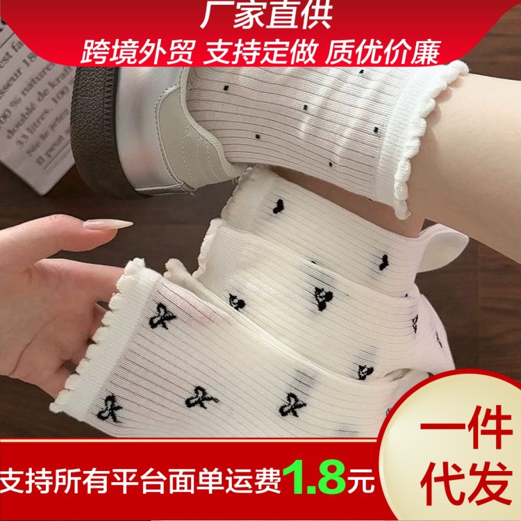 夏の日本のシンプルな蝶結びの中筒の靴下の女性の薄いタイプの白いレースのメッシュの通気性の木の耳の縁の靴下の女性